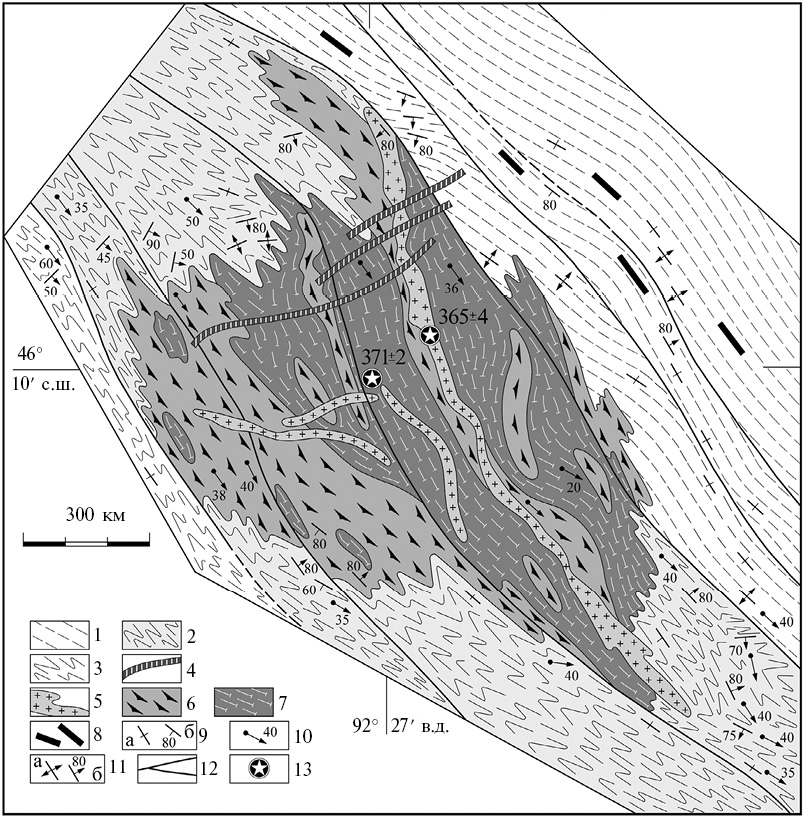 Рис. 8. Схема геологического строения массива Эхний-ус, Бодончинская тектоническая пластина. 1 – толща переслаивания гнейсов, амфиболитов и гранат-кианит-ставролитовых сланцев; 2 – толща переслаивания биотитовых и гранат-биотитовых гнейсов с гранат-пироксеновыми сланцами, кальцифирами и амфиболитами; 3 – толща амфиболовых сланцев; 4 – постметаморфические аплиты и пегматоидные граниты; 5–7 – интрузивные породы массива Эхний-ус, метаморфизованные при позднем эпизоде М2: 5 – трондьемиты, 6 – роговообманковые диориты и габбро-диориты, 7 – расслоенное габбро, амфиболизированные габбро, габбро-пироксениты; 8 – дайки гашуннурского комплекса; 9 – кристаллизационная сланцеватость (а – вертикальная, б – наклонная); 10 – ориентировка шарниров складок, связанных с метаморфизмом M2; 11 – ориентировка линейности и шарниров ранних складок, характеризующих структуры метаморфизма M1; 12 – разломы и сдвиговые зоны, параллельные главным картируемым северо-западным складкам, связанным с метаморфизмом M2; 13 – положение геохронологических проб (Бибикова и др., 1992): трондьемиты (365 ± 4 млн лет, 92°27′34″ в.д., 46°10′00″ с.ш.); расслоенное габбро (371 ± 2 млн лет, координаты: 92°27′36″ в.д., 46°09′45″ с.ш.).