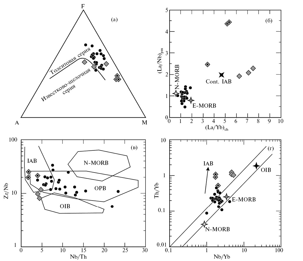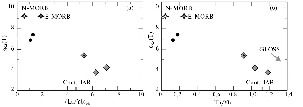 Отдельно следует отметить проявления позднедевонского магматизма в юго-западной части Китайского Алтая, где фиксируются диабазовые дайки и базальты с геохимическими и изотопными характеристиками, близкими к базальтам срединно-океанических хребтов или задуговых бассейнов (Cai et al., 2010; Yang et al., 2014; Ma et al., 2018). Такие вещественные характеристики мафических пород показывают сходство с метабазитами гашуннурского комплекса, а их возраст оценивается около 383–376 млн лет, т.е. попадает в интервал между ранним и поздним эпизодами метаморфизма монгольского сегмента ЮАМП, когда и происходило становление метабазитов гашуннурского комплекса. Таким образом, позднедевонский базитовый магматизм преимущественно астеносферной природы фиксируется вдоль южных границ Китайского и Монгольского Алтая на значительном протяжении, по меньшей мере 1000 км. Геодинамическая интерпретация этого базитового магматизма в Китайском Алтае связывается с погружением в зону субдукции срединно-океанического хребта с раскрытием астеносферного окна и, как следствие, рифтогенезом на поверхности (Ma et al., 2018).
