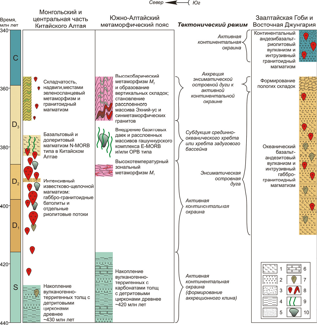 Рис. 13. Схема корреляции основных тектонических процессов в области взаимодействия континентальных (Монгольский и центральная часть Китайского Алтая, Южно-Алтайский метаморфический пояс) и океанических (Заалтайская Гоби и Восточная Джунгария) структур. 1–3 – вулканические породы: 1 – базальты, 2 – андезиты, 3 – дациты и риолиты; 4–6 – осадочные породы: 4 – алевролиты, 5 – песчаники, 6 – известняки; 7–10 – интрузивные породы: 7 – гранитоиды (размер и частота значков пропорциональны интенсивности магматизма), 8 – габброиды, 9 – дайки основного состава, 10 – расслоенные массивы.