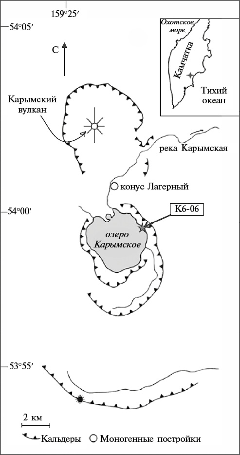Рис. 1. Cхема геологического строения Карымского вулканического центра. Звездочкой обозначено место отбора обр. K6-06. На врезке показано положение Карымского вулканического центра на Камчатке.