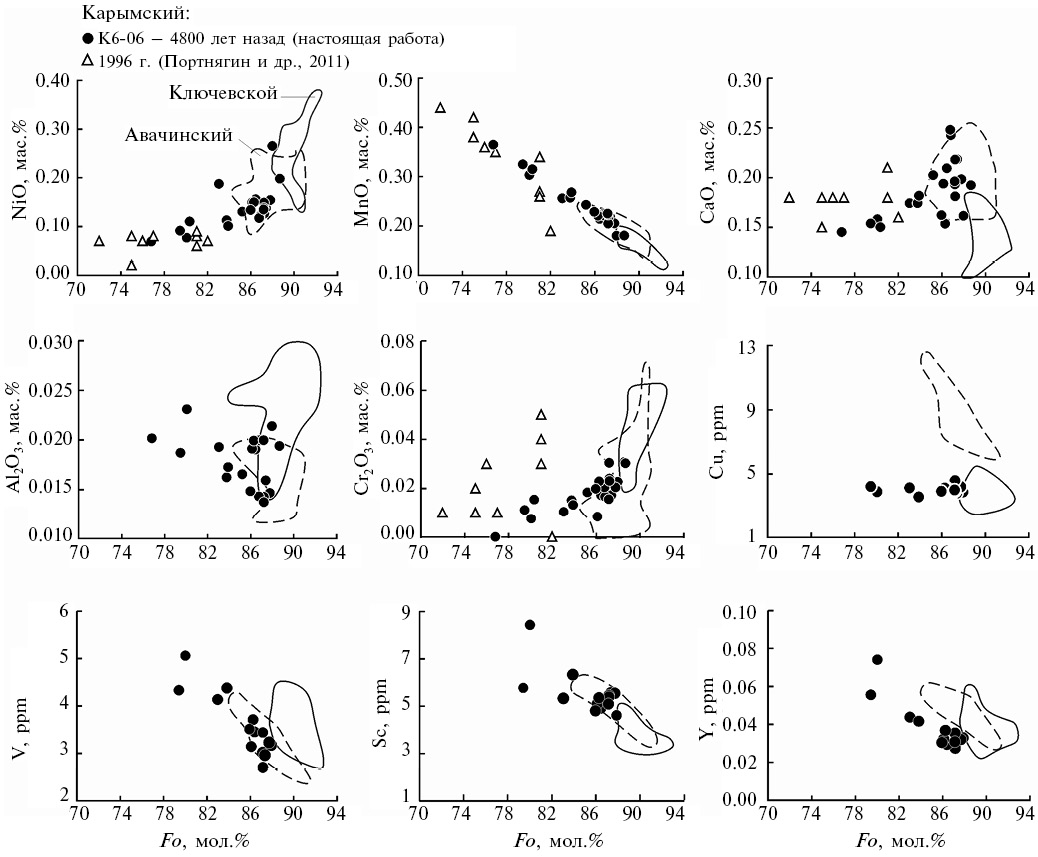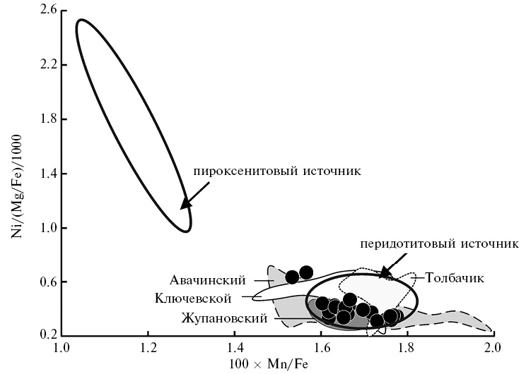 Для проверки возможного вклада пироксенитового источника в образование магм Карымского вулкана мы использовали критерий из работы (Sobolev et al., 2007), основанный на анализе содержания микроэлементов в высокомагнезиальном оливине в вулканических породах различных геодинамических обстановок. Как показано на рис. 9, магнезиальные оливины Карымского вулканического центра соответствуют типичным характеристикам магм из перидотитового источника. О перидотитовом источнике первичных магм также свидетельствуют данные по составу оливина из пород вулканов Авачинский, Жупановский, Ключевской и Толбачик (Портнягин и др., 2005, 2017; Плечова и др., 2011; Kamenetsky et al., 2017), что, вероятно, является типичным для большей части вулканического фронта Камчатки.