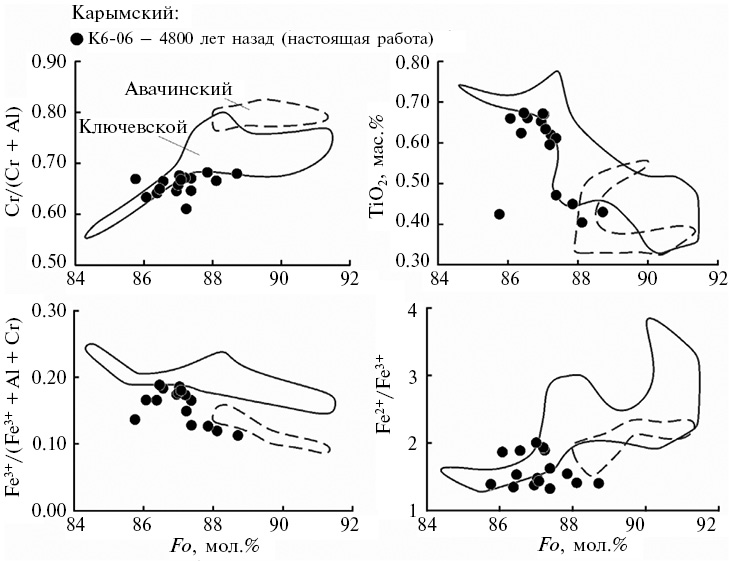 Приведенные примеры показывают, что исходное содержание воды в островодужных магмах в целом, и магмах Камчатки в частности, должно быть пересмотрено на основе детальных исследований конкретных объектов и применения независимых методов оценки исходного содержания Н2О в островодужных магмах (Sobolev et al., 2016; Назарова и др., 2017). Для магм Восточного вулканического фронта Камчатки эта задача особенно актуальна, поскольку для этого региона данные прямого измерения содержаний H2O в примитивных расплавных включениях крайне малочисленны (Portnyagin et al., 2007). В настоящей работе мы приводим первые оценки исходного содержания Н2О, условий кристаллизации и образования примитивных расплавов Восточного вулканического фронта, полученные при исследовании составов минералов и расплавных включений в высокомагнезиальном оливине из пород Карымского вулканического центра.