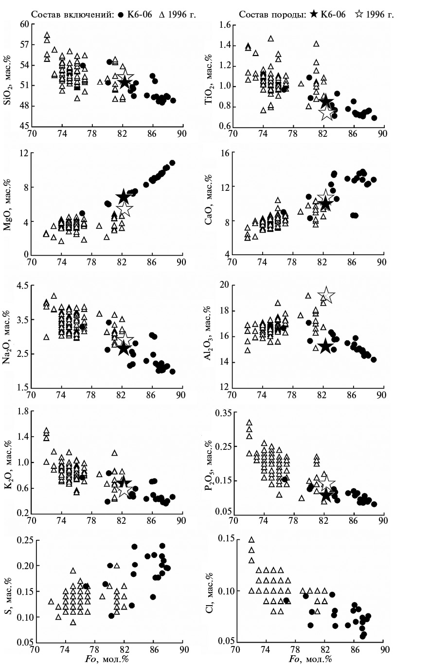 - Составы расплавных включений в оливине позволяют оценить состав родоначальных магм, в том числе для летучих компонентов. Максимальное измеренное содержание Н2О в расплавах составляет ~ 4 мас.%, что почти соответствует оценке, полученной при сравнении данных ликвидусной термометрии и оливин-шпинелевого термометра (4.4 ± 1.2 мас.%) (Назарова и др., 2017).