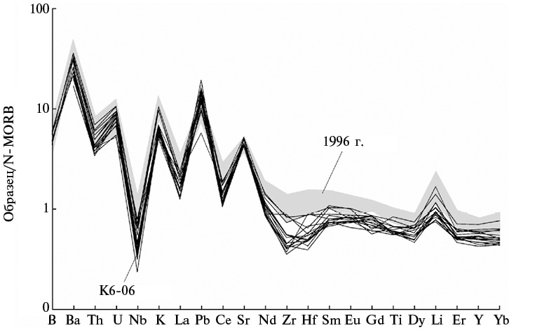 Согласованность трендов кристаллизации родоначальных расплавов изученного образца и базальтов 1996 г. (рис. 4) указывает на то, что вся серия пород Карымского вулканического центра могла быть получена при коровой дифференциации единого родоначального расплава. Состав этого расплава по содержанию главных и микроэлементов может быть оценен на основе данных по составу расплавных включений в оливине, полученных в настоящей работе. В качестве родоначального расплава мы приняли расплав с наиболее примитивным составом оливина, наблюдаемом в породе, и оценили его усреднением составов расплавных включений в оливине Fo87-89. Состав первичного расплава, который мог находиться в равновесии с мантийным веществом, был смоделирован добавлением к нему оливинового компонента до достижения равновесия с оливином Fo90-92(табл. 5).