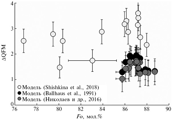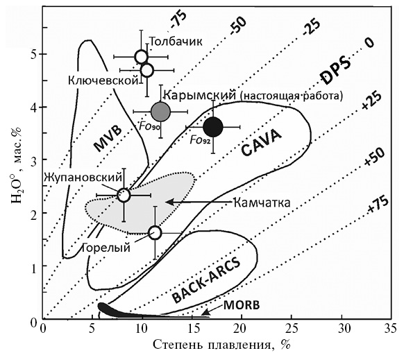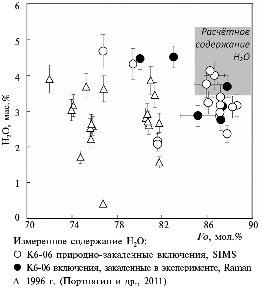 Результаты, полученные для вулканов Камчатки в последние годы, показывают, что оцененные ранее содержания Н2О в расплавах, вероятно, являются минимальными. Экспериментальная гомогенизация расплавных включений в высокомагнезиальном оливине из пород Ключевского вулкана при высоких давлениях (Mironov et al., 2015) показала, что эти включения имели исходные содержания Н2О не менее 4–5 мас.%. Каменецкий В.С. с соавторами (Kamenetsky et al., 2017) обнаружили, что исходные расплавы Толбачинского Дола также имели около 5 мас.% Н2О на основе анализа очень крупных (> 100 мкм) и, следовательно, менее подверженных потере водорода включений. В обоих примерах новые оценки исходных содержаний H2O в магмах на 1–2 мас.% выше, чем предполагалось ранее (Sobolev, Chaussidon, 1994; Хубуная, Соболев, 1998; Portnyagin et al., 2007).
