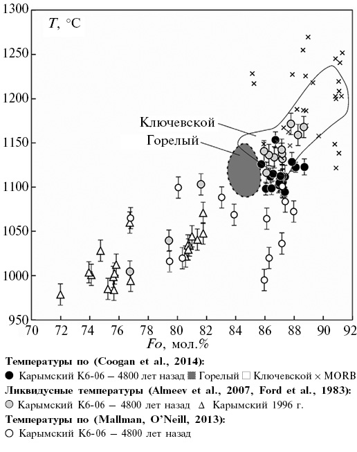 В работе (Portnyagin et al., 2007) были получены данные по температурам плавления мантии для пяти вулканов Камчатки. Составы расплавов были скорректированны до равновесия с оливином Fo90-91. Таким образом, если скорректировать исследуемый в настоящей работе состав расплава до Fo90 (рис. 10), получим, что первичный расплав Карымского вулканического центра (Fo90) может быть образован в результате ~12 мас.% плавления обогащенного источника MORB (E-DMM). В этом случае плавление мантии происходило при температуре ~40°C ниже солидуса «сухого» перидотита (рис. 10), что соответствует ~ 1230°C. Определенные нами оценки температур плавления мантии под Карымским вулканическим центром ниже, чем полученные ранее в работе (Portnyagin et al., 2007). Это является прямым следствием более высоких оценок содержания Н2О в исходной магме, установленных в нашей работе. Более низкие оценки температур также получаются и для других вулканов Камчатки, для которых есть новые более надежные данные по содержанию Н2О в исходных расплавах. Например, результаты из (Mironov et al., 2015; Kamenetsky et al., 2017) по содержанию H2O = 4–5 мас.% в первичных расплавах вулканов Ключевской и Толбачик понижают оценки температур их образования до 75°C ниже солидуса «сухого» перидотита.
