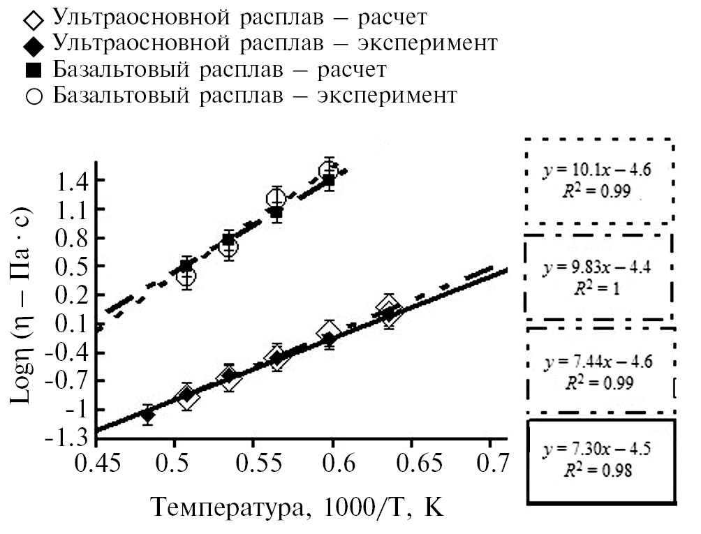 Рис. 1. Температурные зависимости вязкости ультраосновных (модельный дунит) и базальтовых расплавов при давлениях флюида (PAr = 100 МПа, базальтовый расплав; РCO2 = 100 MПа, ультраосновной расплав). Погрешность экспериментальных и расчетных данных ± 30 отн.% (Persikov, 1998; Persikov, Bukhtiyarov, 2009; Persikov et al., 2018).