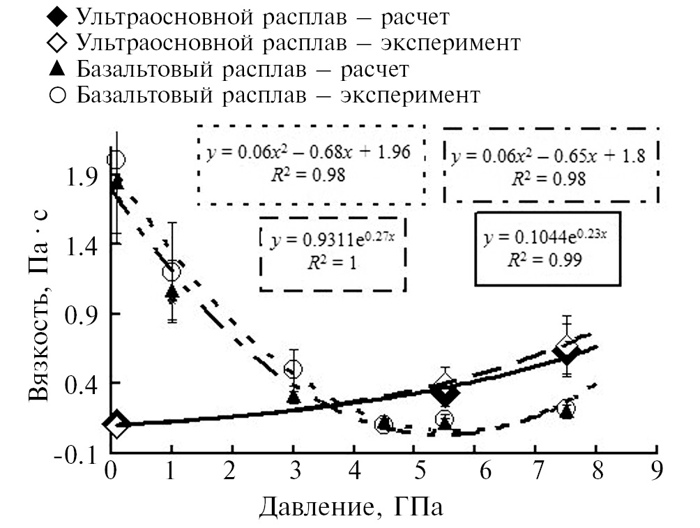 Соотношение прогнозных и экспериментальных данных для водосодержащих гранитоидных расплавов детально рассматривалось ранее (Персиков, 1984; Persikov, 1991, 1998; Persikov et al., 1990). На рис. 1 и 2 в качестве дополнительного примера достоверности прогноза вязкости магм по этой модели приведено сравнение новых экспериментальных и расчетных данных по температурной и барической зависимости вязкости ультраосновных (модельный дунит) и базальтовых расплавов в широком диапазоне температур (1300–1950°С) и давлений (0.1–7.5 ГПа) в земной коре и верхней мантии.