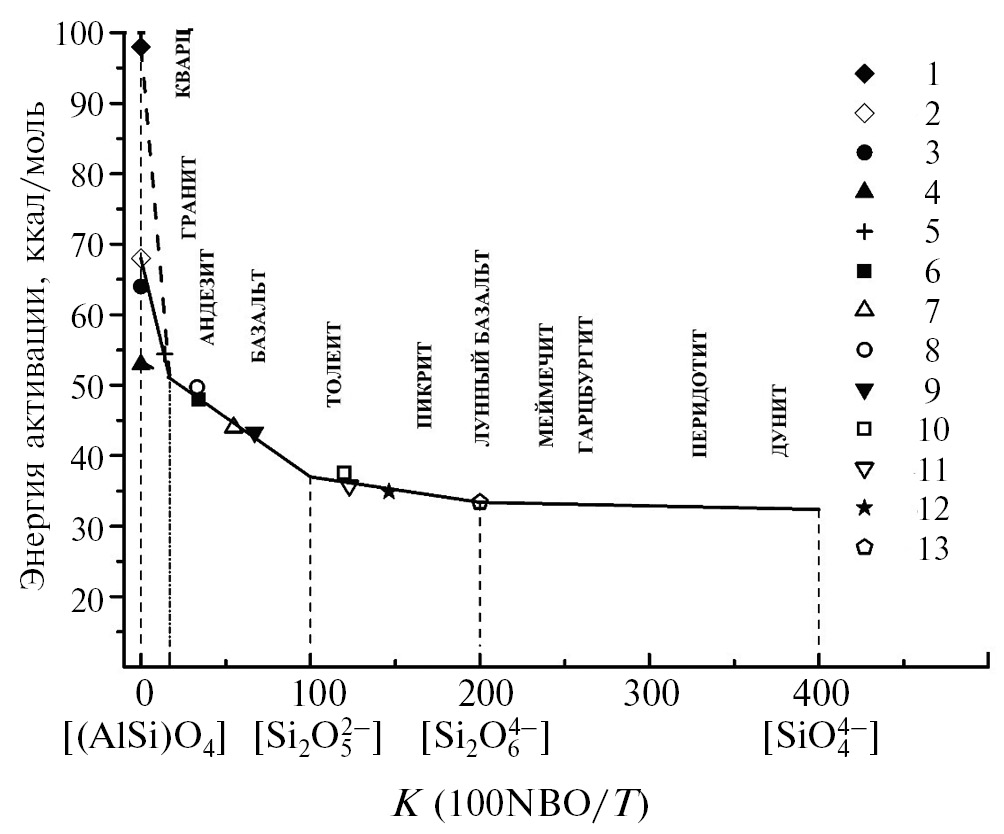 Рис. 3. Обобщенная структурно-химическая зависимость энергий активации вязкого течения модельных и магматических расплавов (в квадратных скобках приведены основные структурные анионы расплавов (Persikov, 1998)). 1 – Qz100, 2 – Ab100 (модельный гранит), 3 – Jd10, 4 – Ne100, 5 – Ab93(H2O)7, 6 – Ab85(H2O)15, 7 – Ab75(H2O)25, 8 – Ab80Di20, 9 – Ab57Di43, 10 – Ab30Di70, 11 – Di92(H2O)8, 12 – Di96(H2O)4, 13 – Di100 (cостав расплавов – мол. %).