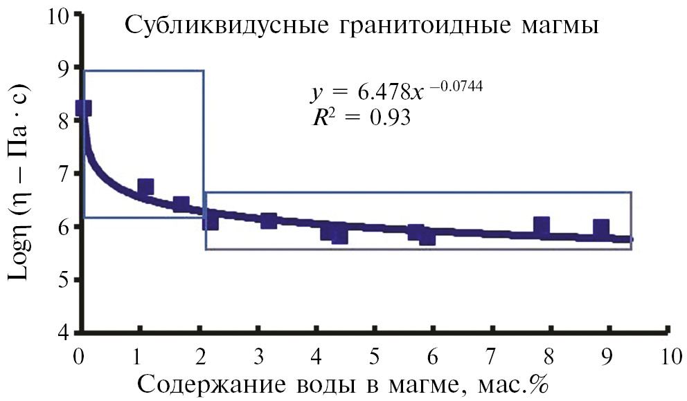 На основе значительного объема экспериментально-теоретических данных достоверно установлено, что из широкого спектра флюидных компонентов кислых магм (Н2О, СО2, НСl, NaCl, HF, NaF, H2S) решающее влияние на их текучесть оказывает вода, растворяющаяся в магмах в двух формах. Растворение воды в расплаве в виде гидроксила ОН– сильно снижает вязкость и значительно увеличивает степень деполимеризации (основность) расплава. Предельная емкость гранитоидного расплава для ОН– составляет 6.4 мас.% (Персиков, 1984; Persikov, 1998). Растворение воды в расплаве в виде молекул Н2О, наоборот, слабо снижает вязкость кислого расплава, не меняя его основности, а псевдобинарная система гранитоидная магма–вода с хорошей степенью приближения моделирует реологическое поведение таких магм во всем диапазоне глубин земной коры. Проблема достоверного определения соотношения ОН–/Н2О в гранитоидных расплавах при различных температурах и давлениях остается дискуссионной (Stolper, 1982; Персиков, 1984; Бернэм, 1983; Кадик и др., 1971; Хитаров и др., 1963). Наши экспериментально-теоретические результаты, а также данные, полученные в ряде других работ (Бернэм, 1983; Nowak, Behrens, 1995), подтверждают упомянутую предельную емкость гранитоидных расплавов по отношению к OH– при высоких температурах. Вместе с тем известно, что в закаленных расплавах (стеклах), полученных при изобарической закалке водосодержащих кислых расплавов (гранит, альбит), особенно при РН2О ≥ 200 МПа, преобладает молекулярная Н2О (Stolper, 1982; Персиков, 1984; Persikov, 1991, 1998; Persikov et al., 1990; Nowak, Behrens, 1995 и ссылки в этих работах).