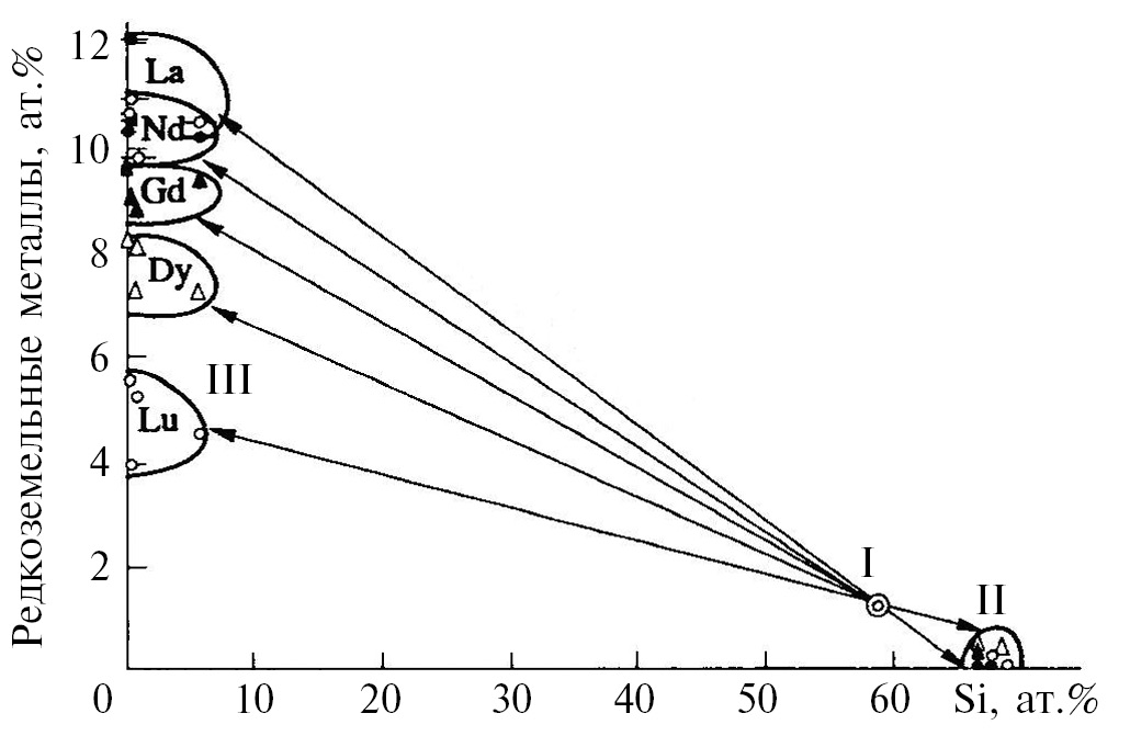Рис. 1. Диаграмма фазового распределения редкоземельных металлов во фторидной гранитной системе. I – исходный состав смеси (гранит + LiF + K2SiF6); II – силикатная фаза; III – фторидная фаза.
