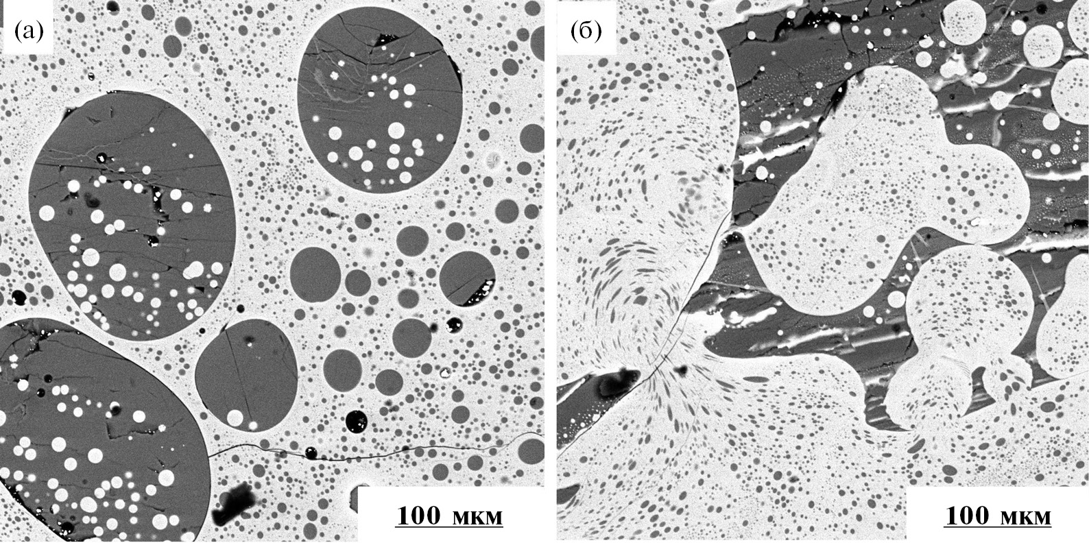 В сухих системах, содержащих Ti, РЗЭ (La, Ce), Y, Sr и Nb, наблюдалось образование кристаллов лопарита в силикатной матрице (рис. 6a). В этих же системах под давлением водного (или щелочного) флюида было получено расслоение расплава на алюмосиликатную жидкость, формирующую матрицу, и богатую Ti, РЗЭ (La, Ce), Y, Sr и Nb с примесью силикатной составляющей, образующую капли (рис. 6б) размером от 1 до 3 мкм (Сук, 2007, 2012). Расплав в каплях резко обогащен Ti, РЗЭ и Nb и обеднен Si и Al. Для TiO2 коэффициенты разделения (К = Скап./Ссил.) больше 5, для SiO2 – меньше 0.35, для Nb2O5 приблизительно составляют 10–20, а для РЗЭ – больше 15. Для SrO коэффициенты разделения варьируют от 2.3 до 7.6. В системах, содержащих Zr, наблюдалось его вхождение в капли. При этом содержание циркония в каплях было значительным (до 8.4 мас.% ZrO2). Полученные данные показывают возможность концентрирования циркония совместно с титаном и редкоземельными элементами в результате процесса жидкостной несмесимости такого типа. Коэффициент разделения ZrO2 между каплями и алюмосиликатным расплавом матрицы (К = Скап./Ссил.) по приблизительным оценкам составляет от ~ 3.5 до 9.