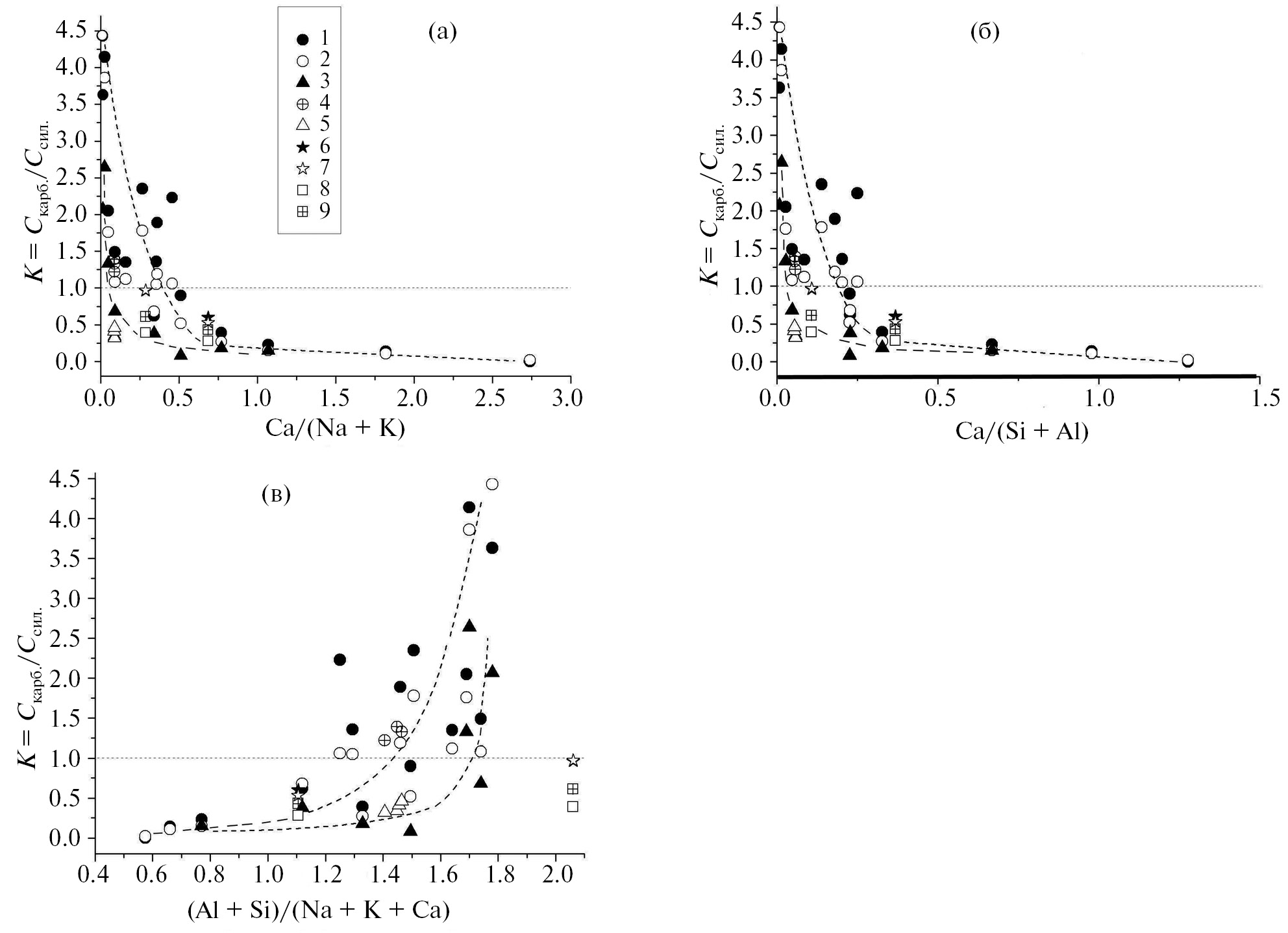 Рис. 5. Коэффициенты разделения (К = Скарб./Ссил.) редкоземельных элементов между силикатным и карбонатным расплавами в зависимости от состава сосуществующего силикатного расплава: (а) – Ca/(Na + K); (б) – Ca/(Si + Al) и (в) – (Al + Si)/(Na + K + Ca) в силикатном расплаве. Данные авторов: 1 – La, 2 – Ce, 3 – Y (при 1100°С и 2 кбар); литературные данные: 4 – La, 5 – Y (Veksler et al., 1998; для 965°С и ~ 940 бар и 1015°С и ~ 850 бар); 6 – La, 7 – Ce, 8 – Yb, 9 – Gd (Hamilton et al., 1989; для 1150°С и 2 кбар).
