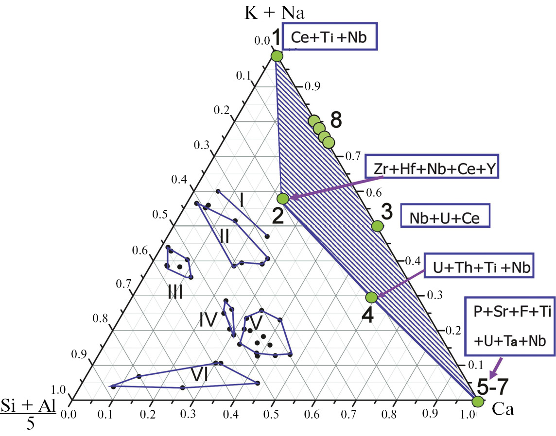 1 – лопарит NaCeTi2O6, 2 – эвдиалит Na15Ca6Fe3Zr3Si26O74Cl, 3 – пирохлор NaCaNb2O6F, 4 – мозандрит Na2Ca4CeTiSi4O15F3, 5 – апатит Ca5P3O12F, 6 – гатчетолит CaU(Ta2Nb,Ti)2O6, 7 – перовскит CaTiO3, 8 – лопариты Ловозерского массива. В рамках указаны концентрирующиеся в них рудные элементы. Средние составы изверженных пород: I – уртиты и ийолиты, II – нефелиновые сиениты, III – граниты, IV – диориты, V – габбро, VI – перидотиты и пироксениты (Войткевич и др., 1970).