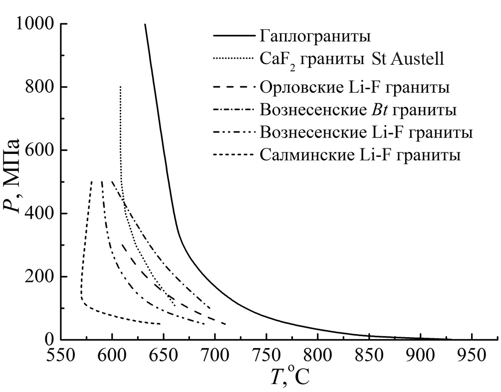 Результаты определения Р-Т параметров солидуса вознесенских биотитовых гранитов и высокодифференцированных вознесенских и салминских литий-фтористых гранитов представлены на рис. 8. Здесь же приведены солидусы гаплогранитов (Johannes, Holtz, 1996), флюоритовых гранитов (St Austell) (Weidner, Martin, 1987) и данные по Li-F гранитам Орловского месторождения (Аксюк, 2009). Полученные результаты показывают, что вознесенские биотитовые граниты при 100–150 МПа начинают плавиться при температуре ~ 675–690°С, которая приблизительно на 40°C ниже температуры плавления гаплогранита и на ~ 25–30°C выше температуры плавления флюоритовых гранитов St Austell. Вознесенские Li-F граниты начинают плавиться при более низкой температуре ~ 605°С при 200 МПа и ~ 620–640°С при 100–150 МПа. Температура их солидуса находится на 60–70°C ниже солидуса гаплогранита, и, по сравнению с Li-F гранитами Орловского месторождения, они также имеют более низкую температуру плавления, что можно объяснить большим содержанием F в вознесенских гранитах. По-видимому, от окончания кристаллизации биотитовых гранитов до завершения кристаллизации Li-F гранитов Вознесенского рудного узла температура могла понизиться почти на 100°C, а давление на ~ 100 МПа. Иначе говоря, вокруг штоков Li-F гранитов в течение длительного времени могли сохраняться благоприятные физико-химические условия для формирования редкометального (Ta, Nb, W, Sn и др.) оруденения. Дайки литий-фтористых гранитов Салминского батолита (Уксинский купол) являются наиболее низкотемпературными, так как содержат значительные количества H2O, F, Li и др., которые понижают температуру солидуса расплава и на несколько порядков его вязкость (Reyf et al., 2000). Экспериментально определенная температура начала плавления этих Li-F гранитов составляет при P = 100–200 МПа около ~ 570°С (рис. 8).