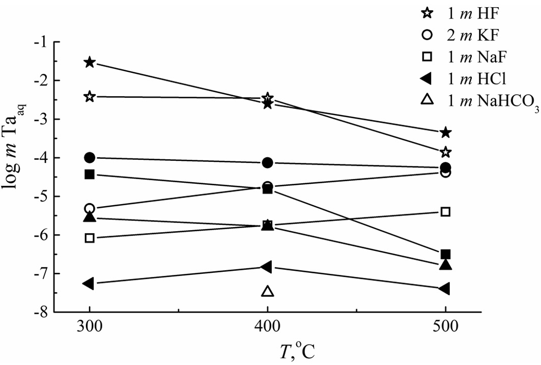 В хлоридных растворах (HCl, KCl, NaCl и LiCl) в диапазоне концентрации от 0.01 до 2 m изучение растворения MnTa2O6 и Ta2O5 при давлении 100 МПа в интервале температуры 300–550°С показало, что содержание Ta в растворе понижается до 10–5–10–8 m, на несколько порядков по сравнению с фторидными растворами (рис. 11; Коржинская и др., 2014). В растворе HСl содержание Ta находится в диапазоне 10–6–10–7 m, в растворе KCl оно несколько выше ~10–5–10–5.8 m и наконец в растворах NaCl и LiCl оно промежуточное ~ 10–5–10–6.4 m. Максимальная концентрация Nb ~ 10–5 m в хлоридных растворах была получена в 1 m растворе HCl.