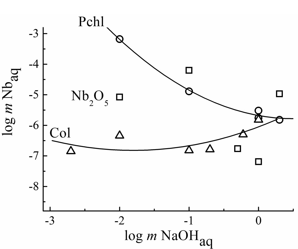 В растворах NaOH с концентрациями от ~ 0.001 до 2 m при 550°С и давлении 100 МПа установлена отрицательная концентрационная зависимость растворимости пирохлора. Максимальное содержание Nb ~ 7×10–4 m получено в растворе 0.01 m NaOH (рис. 13) (Korzhinskaya, Kotova, 2011). Растворимости Nb2O5 ~ 10–4–10–7 m и колумбита ~ 10–6–10–7 m заметно ниже и в меньшей степени зависят от концентрации щелочного раствора. Содержание Ta при растворении Ta2O5, пирохлора и колумбита в щелочных растворах NaOH находится в диапазоне 10–5–10–8 m. С увеличением температуры в интервале 300–550°С растворимость пирохлора уменьшается от 10–5 до 10–6.5 m, а растворимость Nb2O5 изменяется слабо и составляет 10–4–10–6 m. Добавление в состав флюида NaF (до 0.1 m) при 500–550°С увеличивает растворимость тантало-ниобатов на 0.5–1.5 порядка (Коржинская, Котова, 2010).