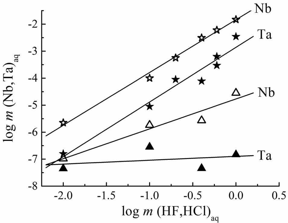 Экспериментально изучены концентрационные и температурные зависимости растворимости природных минералов: колумбита (из Этыкинского месторождения, состав приведен выше), пирохлора (мас.%: 7.6 Na2O, 14.3 CaO, 71.6 Nb2O5, 0.8 TiO2, 5.2 F; кора выветривания карбонатитового месторождения Татарка; Шаповалов и др., 2011), а также оксидов Ta2O5 (аналог минерала тантита) и Nb2O5 (аналог минерала ниобоксида) во фторидных (HF, KF, NaF, LiF), хлоридных (HCl, KCl, NaCl, LiCl) и карбонатно-щелочных (Na2CO3(+ NaF) и NaOH(+ NaF)) гидротермальных растворах (или флюидах) в широком диапазоне концентраций 0.01–2 m при T = 300–550°С, Р = 50–100 МПа и низкой фугитивности кислорода (буферы Со-СоО и Ni-NiO) (Зарайский и др., 2008; Коржинская и др., 2014; 2017; Котельников и др., 2018; Лукьянова и др., 2017; Шаповалов и др., 2011; Zaraisky et al., 2010). Выбор простых оксидов Та и Nb связан с тем, что их растворимость ограничивает верхний предел концентрации этих элементов в гидротермальных растворах, поскольку природные Ta-Nb минералы сложного состава, как правило, имеют меньшую растворимость, чем простые оксиды этих металлов.