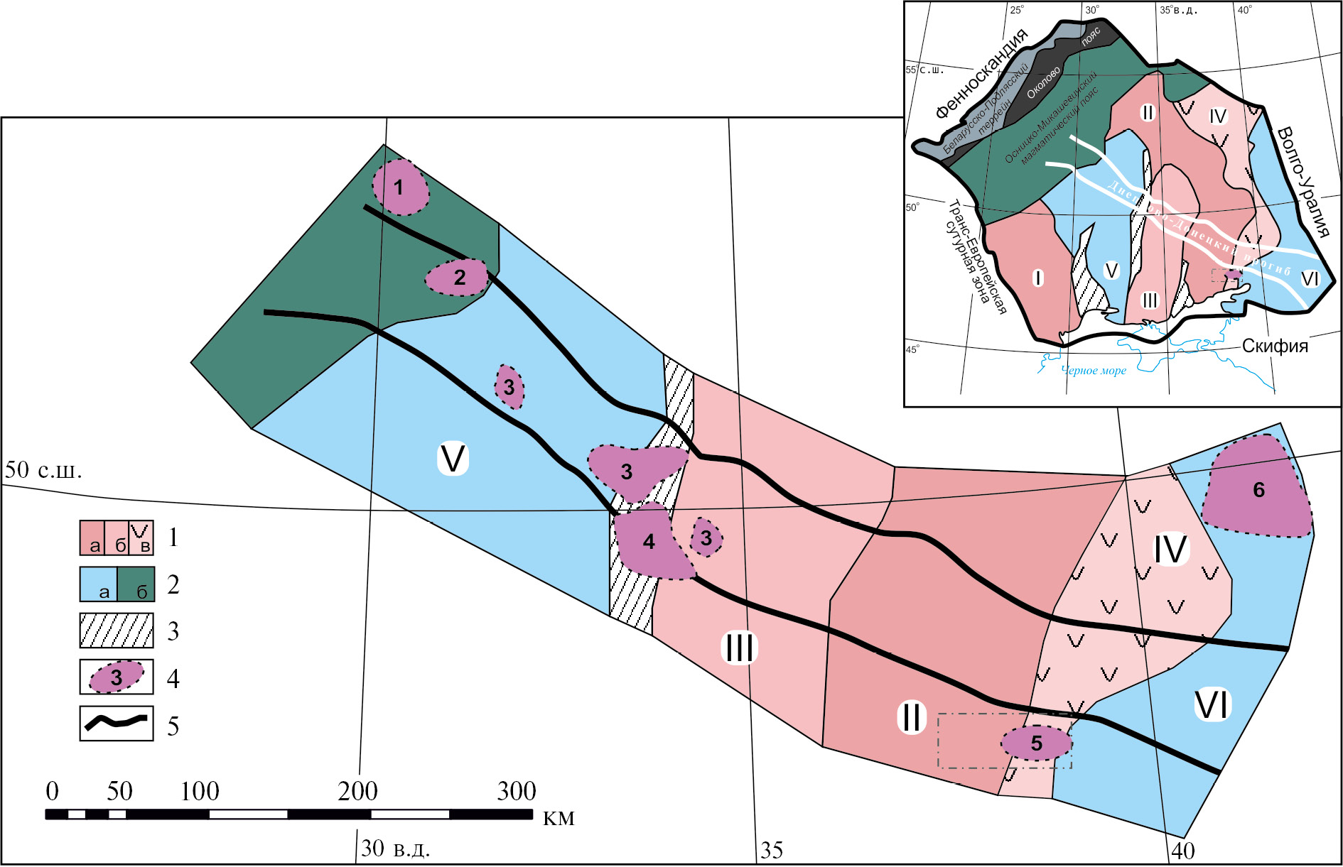 Рис. 1. Тектоническая схема Припятско-Днепрово-Донецкой рифтовой зоны и ареалы распространения девонских магматических пород. На врезке – тектоническая схема палеократона Сарматия, по (Bogdanova et al., 2016), с изменениями и дополнениями. 1 – архейская кора с возрастом: а – 3.8–2.7 млрд лет, б – 3.2–2.7 млрд лет, в – переработанная около 2.1–2.0 млрд лет назад в пределах Восточно-Воронежского аккреционного орогена; 2 – палеопротерозойская континентальная кора: с возрастом: a – 2.3–2.1 млрд лет, б – 2.0–1.95 млрд лет; 3 – коллизионные шовные зоны 2.05–2.0 млрд лет; 4 – области распространения девонских магматических пород: 1 – Жлобинской седловины, 2 – Припятской впадины, 3 – долеритов Днепрово-Донецкого прогиба, по (Wilson, Lyashkevich, 1996), 4 – ультрамафитов и субщелочных базальтов Днепрово-Донецкого прогиба, 5 – кимберлитов, щелочно-мафических и ультрамафических пород Восточного Приазовья, 6 – Воронежского кристаллического массива; 5 – границы Припятско-Днепрово-Донецкой рифтовой зоны. Прямоугольником показана площадь работ на рис. 2. Римскими цифрами обозначены структуры: I – Подольский блок; II – Азовско-Курский блок; III – Сумско-Среднеприднепровский блок; IV – Восточно-Сарматский ороген; V – Ингульско-Севский блок; VI – Волго-Донской ороген.
