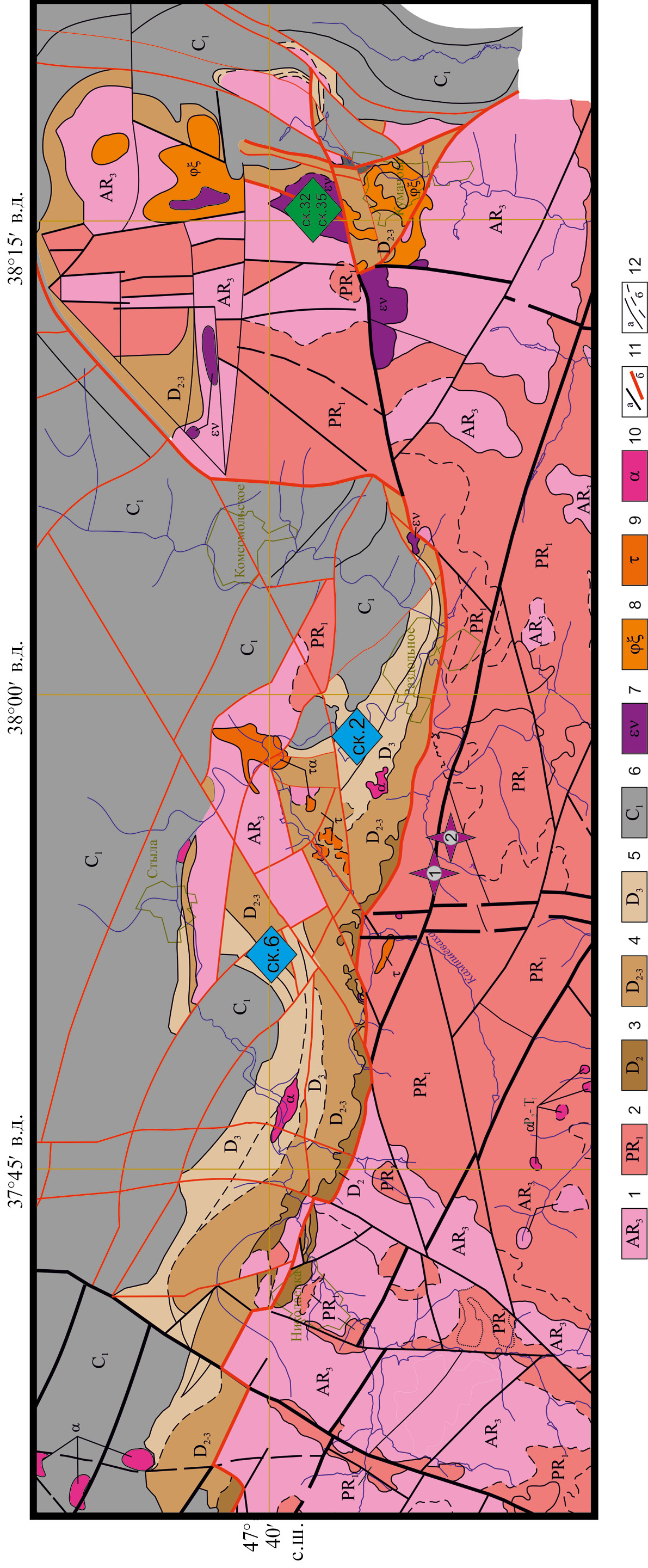 Рис. 2. Схематическая геологическая карта области распространения девонских пород в Восточном Приазовье, по (Геологiчна карта …, 2007), с упрощениями. Кристаллический фундамент: 1 – неоархей, кварцевые диориты, гранодиориты, 2 – палеопротерозой, лейкограниты, граниты, граносиениты; девонские отложения: 3 – D2, карбонатно-терригенные отложения, 4 – D2-3, лавы и туфы антон-тарамской свиты, пикриты, пикробазальты, базальты, трахибазальты, трахиты, 5 – D3, конгломераты, гравелиты, песчаники, 6 – C1, известняки, доломиты, песчано-глинистые породы; Покрово-Киреевский массив: 7 – щелочные габброиды, перидотиты, пироксениты (D2-3), 8 – нефелиновые и щелочные сиениты; вулканиты (D3–C3), 9 – трахиты (С2), 10 – андезиты (P2–T1); 11 – разломы: a – домезозойские, б – разломы мезозойские и более поздние, 12 – геологические границы, a – достоверные, б – предполагаемые и фациальные. Звездочками показаны кимберлиты Восточного Приазовья: 1 – трубка Новоласпинская, 2 – трубка Южная. ск. 32, ск. 35 – скважины Покрово-Киреевского массива, ск. 2 – скважина, Комсомольская площадь, ск. 6 – скважина, Стыльская площадь.