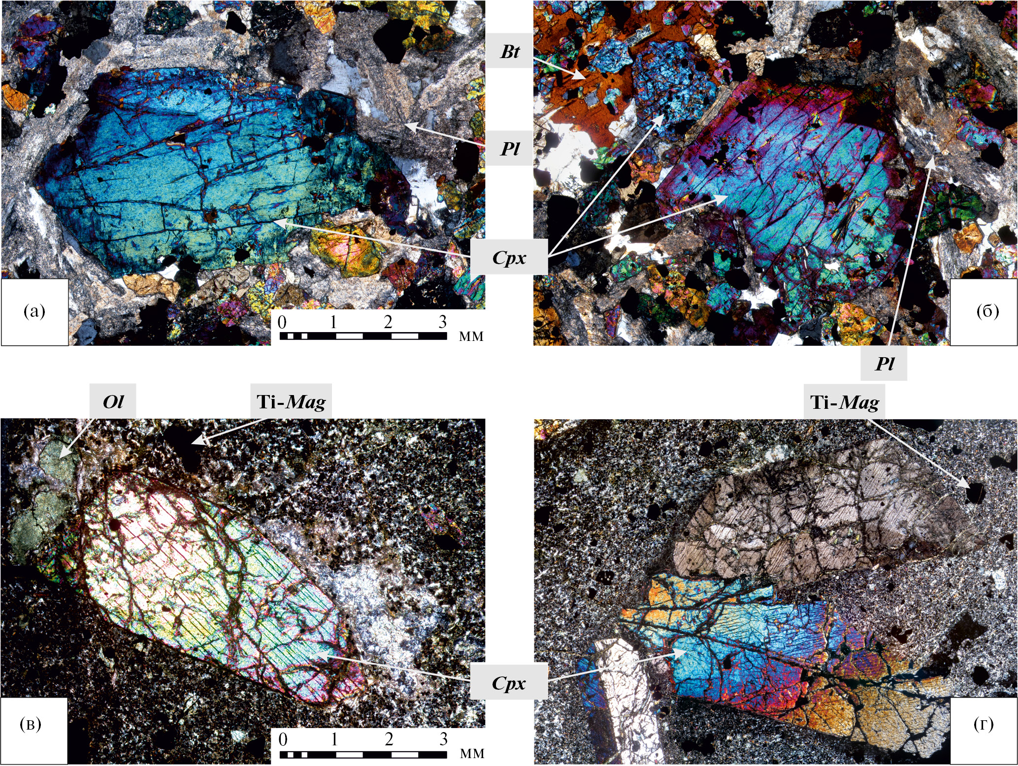 Рис. 3. Петрографические особенности слюдяного габбро (обр. 12Az35/274) (а, б) и щелочного пикрита (12Az6/073) (в, г). Николи скрещены. Поперечник поля зрения около 7 мм. (а, б) – порода имеет гипидиоморфнозернистую неравномернозернистую порфировидную структуру. Крупные кристаллы клинопироксена образуют идиоморфные зерна и цементируются более мелкими зернами кинопироксена, субпризматическим плагиоклазом (а) и биотитом (б). (в, г) – порода имеет порфировую структуру. Крупные вкрапленники представлены клинопироксеном (в, г), мелкие – полностью измененным оливином (в) и титаномагнетитом (г). Структура основной массы интерсертальная.