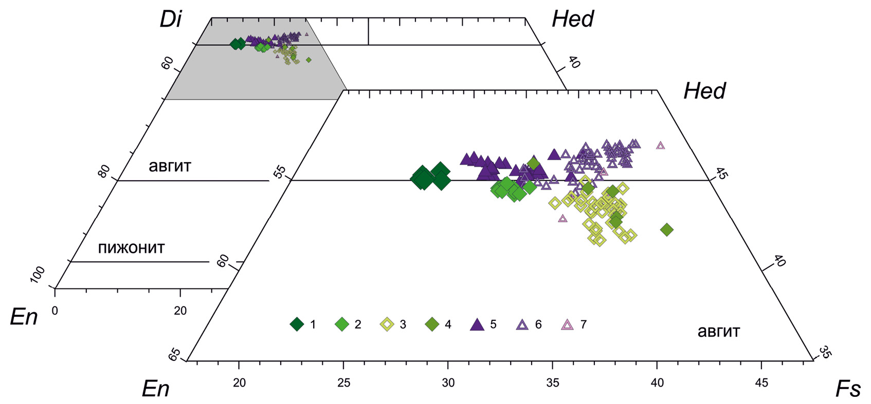Рис. 4. Классификационная диаграмма для клинопироксенов, по (Morimoto, 1988). Клинопироксены из биотитового габбро: 1 – ядра Срх1, 2 – ядра Срх2, 3 – внешние зоны Срх3, 4 – мелкие зерна; клинопироксены из щелочного пикрита: 5 – ядра Срх2, 6 – внешние зоны Срх3, 7 – микролиты.