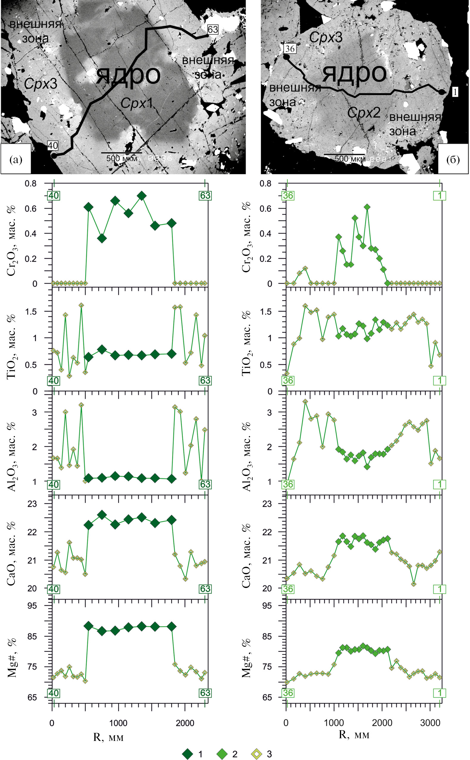 Рис. 5. Морфология и характер зональности клинопироксенов из слюдяного габбро. (а) – зерно клинопироксена с ядром Cpx1 и внешней зоной Срх3. Ядро отличается высокой Mg#, повышенными содержаниями Cr и Са; (б) – зерно клинопироксена с ядром Срх2 и внешней зоной Срх3. Ядро Срх2 менее Mg#, содержит меньше Cr и Са, чем Срх1. На BSE-изображениях клинопироксенов показана линии профилей химических составов. Обр. 2Az35/274. На профилях составов: 1 – ядро Срх1, 2 – ядро Срх2, 3 – внешние зоны Срх3.