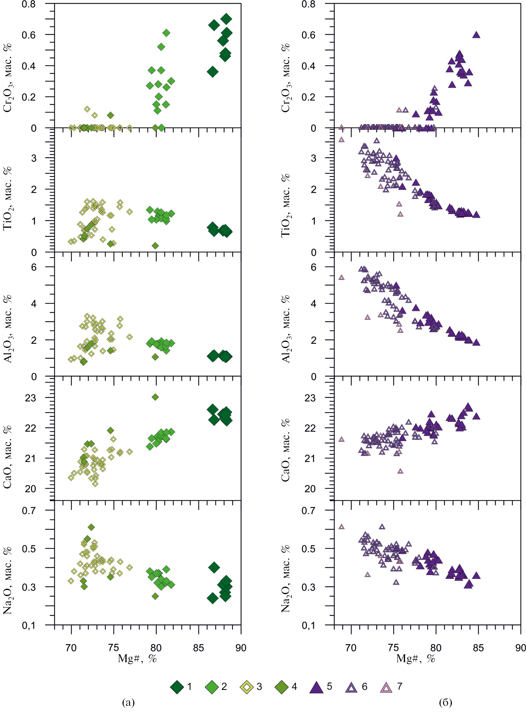 По магнезиальности (Mg# = Mg/(Mg + Fe)) и другим химическим характеристикам ядра крупных клинопироксенов можно разделить на два типа: Cpx1 и Cpx2 (рис. 5б, 6а). Для Cpx1 характерна высокая Mg# = 0.87–0.88 при концентрациях (мас.%): Cr2O3 0.36–0.66, TiO2 0.64–0.78 и Al2O3 1.07–1.15. Сpx2 имеют Mg# = 0.80–0.81 при концентрациях (мас.%): Cr2O3 до 0.61, TiO2 0.98–1.34 и Al2O3 1.42–1.92 (рис. 5б, 6а).