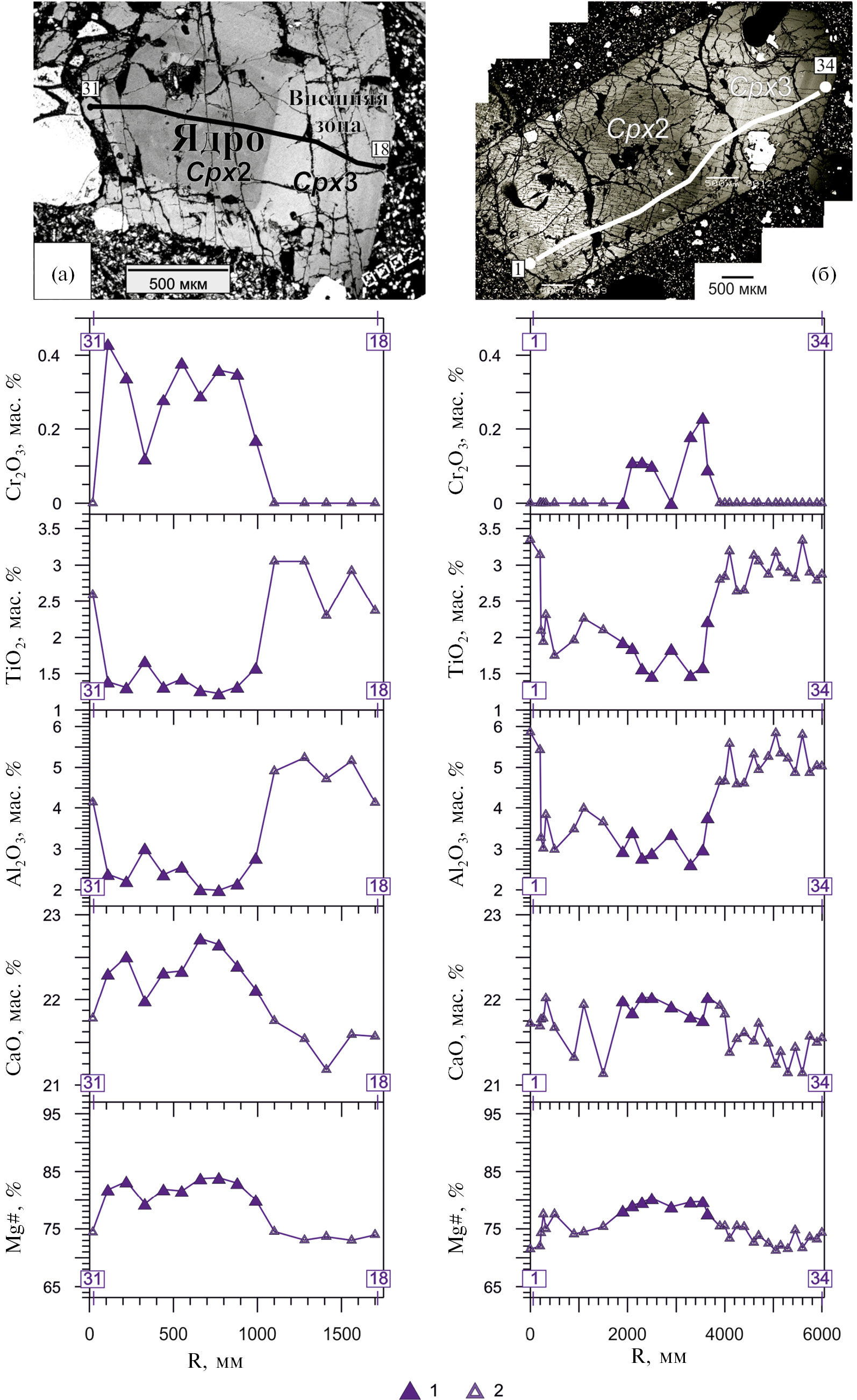 Магнезиальность отдельных ядер как Cpx1, так и Cpx2 весьма однородна (рис. 5, 6а). Она снижается только в светлых пятнообразных участках, возникновение которых, очевидно, связано с более поздним взаимодействием пироксена с эволюционирующим расплавом.