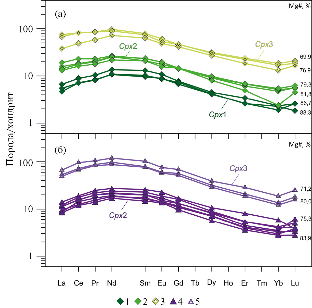 Ядра Cpx1 характеризуются высокими значениями Mg# (0.87–0.88) и повышенными содержаниями Сr (до 0.66 мас.% Cr2O3, табл. 2). Высокая магнезиальность и хромистость Cpx1, указывают, что в качестве равновесного ему расплава мог служить наиболее ранний слабо дифференцированный состав, близкий к первичному.
