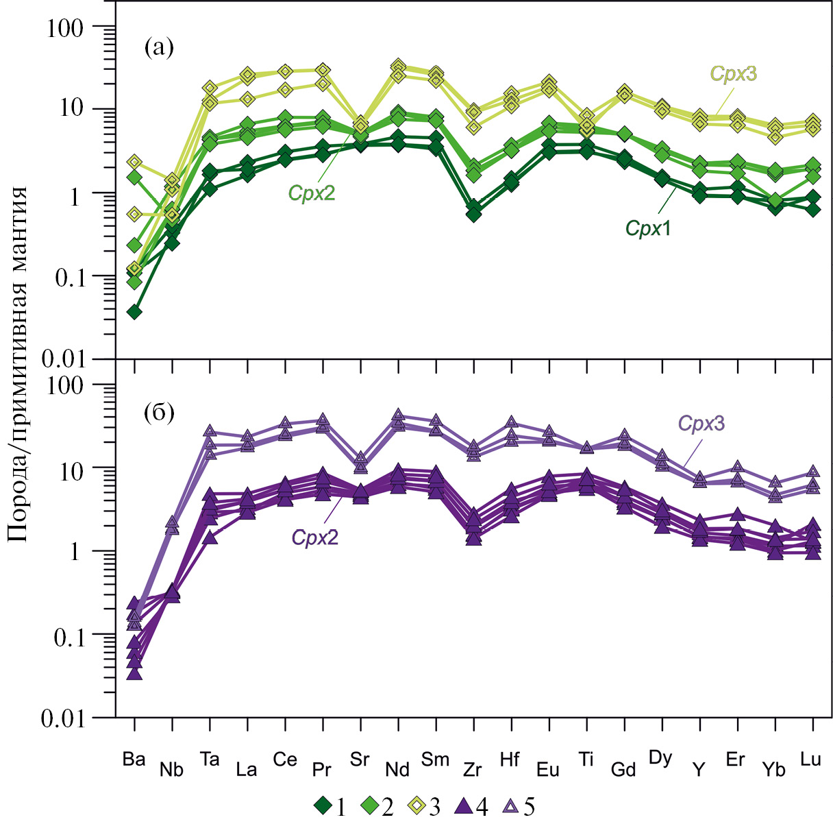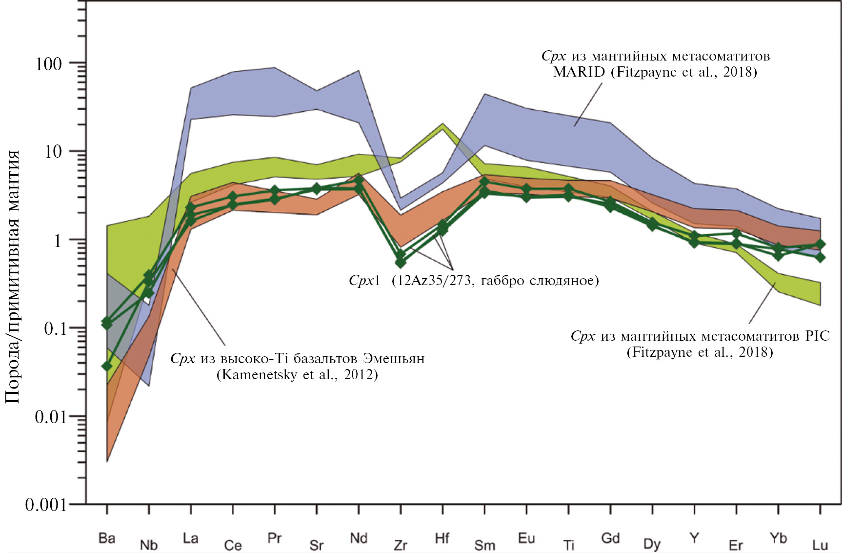 Клинопироксены в слюдяном габбро ПКМ и лавах щелочных пикритов АТС имеют зональное строение. Клинопироксены в габбро сложены ядрами Cpx1 (Mg# = 0.87–0.88) или Сpx2 (Mg# = 0.80–0.81) и внешними зонами Cpx3 (Mg# = 0.70–0.76). Клинопироксены в щелочном пикрите сложены ядрами Сpx2 (Mg# = 0.80–0.84) и внешними зонами Cpx3 (Mg# = 0.71–0.78). Мультиэлементные спектры клинопироксенов имеют в целом куполовидный характер с обогащением легкими REE и резким обеднением Ba, Nb, тяжелыми REE, выраженной Zr-Hf отрицательной аномалией, в Cpx2 и Cpx3 появляется отрицательная Sr-аномалия.