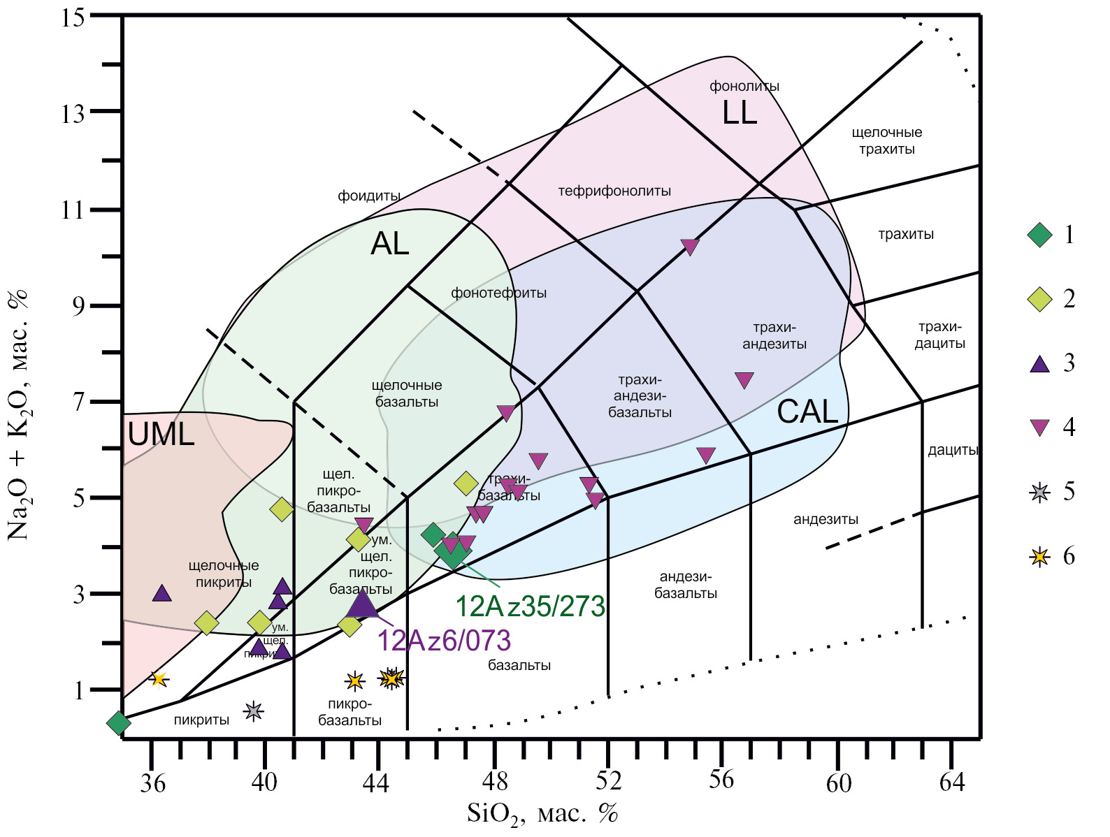 Щелочные пикриты, в которых изучался клинопироксен, вместе со слюдяными щелочными пикритами, базанитами и трахибазальтами слагают вулканические потоки нижних частей разреза АТС.