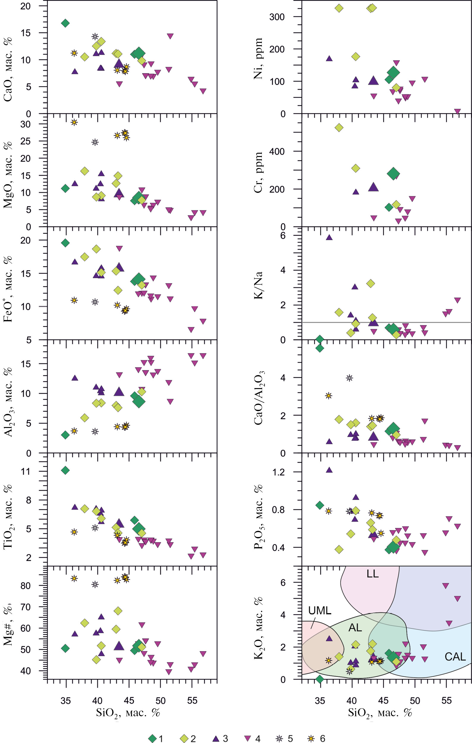Таким образом, на основании морфологии зерен и содержания петрогенных элементов для слюдяных габбро ПКМ и щелочных пикритов АТС выделен клинопироксен высокомагнезиальных ядер (Cpx1), магнезиальных ядер (Cpx2), внешних зон крупных зерен (Cpx3), микролиты в пикритах и мелкие зерна в габбро. Величины Mg#, а также содержания Cr2O3 CaO, Na2O в Cpx2 для обоих типов пород близки. Содержания TiO2 и Al2O3 для ядер вкрапленников клинопироксена щелочного пикрита несколько выше. Тип Cpx1 является наиболее магнезиальным, высокохромистым, низкотитанистым и низкоглиноземистым и обнаружен только в габброидах ПКМ (табл. 2).