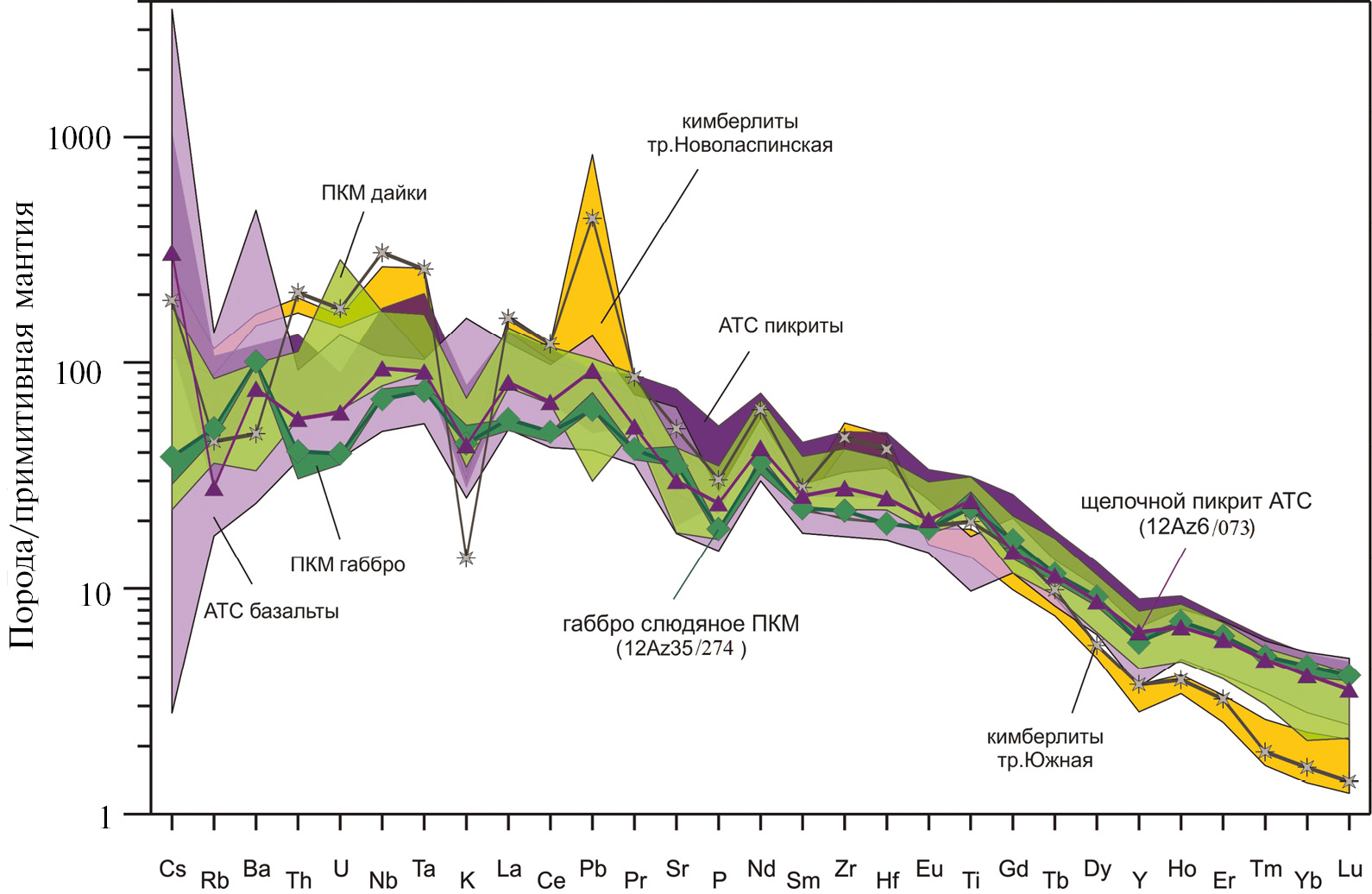 Распределение REE (рис. 12) во всех породах характеризуется сильным фракционированием легких лантаноидов относительно тяжелых: значение (La/Yb)n варьирует от 12 до 40. Наиболее фракционированы REE в лампрофирах, что отражают высокие значения (La/Sm)n (3.1–3.8) и очень высокие (Gd/Yb)n (5.3–5.5). В ультраосновных лавах степень фракционирования легких REE несколько ниже ((La/Sm)n = 2.9–3.1) при том, что слюдяные щелочные пикриты и базаниты АТС столь же сильно деплетированы тяжелыми REE ((Gd/Yb)n = 4.7–5.6) как и лампрофиры ПКМ. В щелочных пикритах АТС значение (Gd/Yb)n снижается до 3.5. Распределение REE в них сходно с таковым в слюдяных габбро и пироксенитах ПКМ. Лавы трахибазальтов также имеют профили REE сильно деплетированные тяжелыми землями, но степень их фракционирования ниже ((Gd/Yb)n = 3.8–4.7), чем в лампрофирах и ультраосновных лавах, при этом легкие REE ((La/Sm)n = 2.8–3.3) фракционированы в той же степени, что и в ультраосновных лавах. Сколь-нибудь значительная Eu-аномалия для пород не характерна: Eu/Eu* варьирует от 0.93 до 1.1, отражая слабую знакопеременную аномалию.