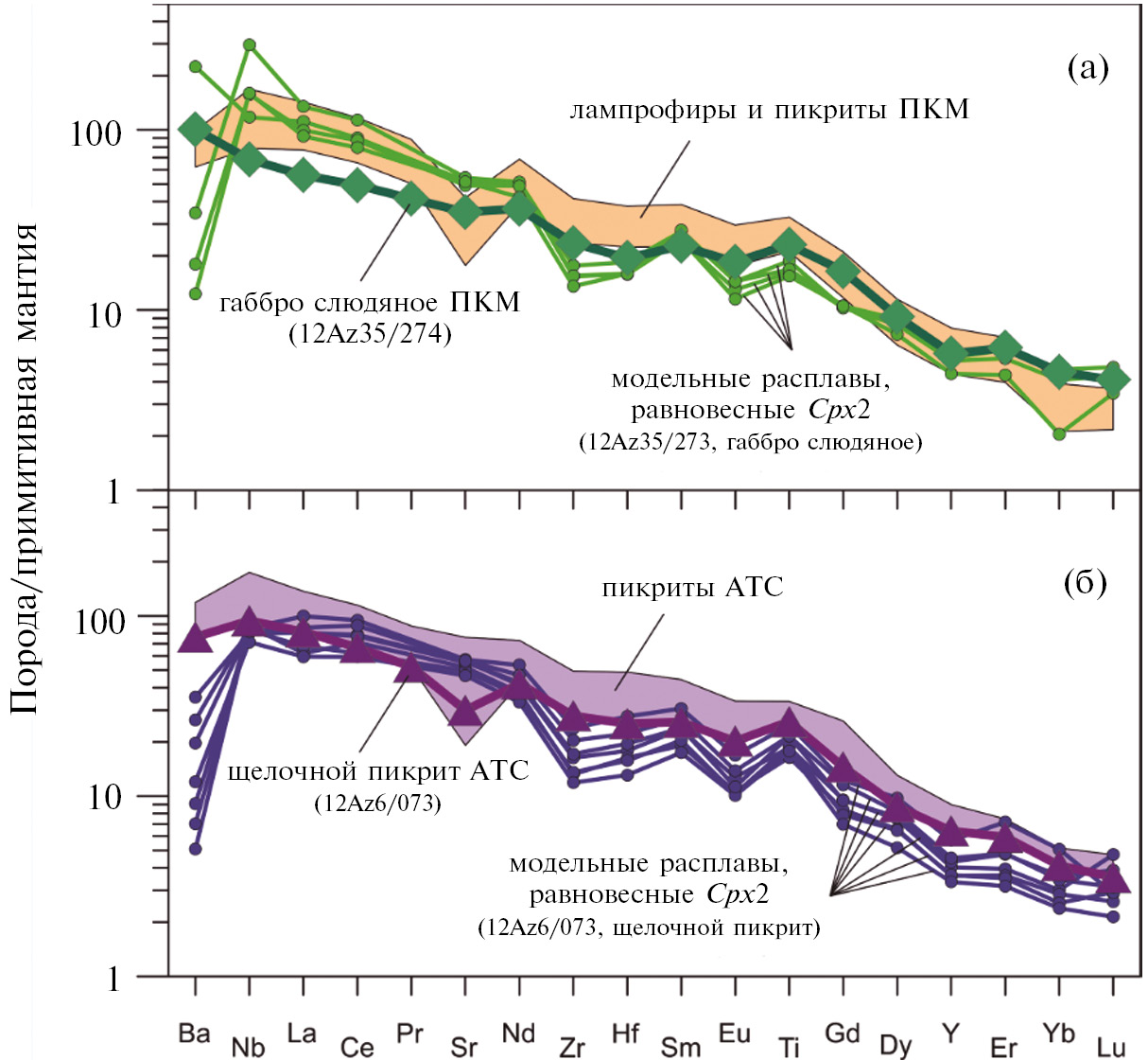 Геохимия расплавов, равновесных клинопироксенам Срх2, и родство расплавов ПКМ и АТС. Для расчета составов расплавов, равновесных ядрам клинопироксенов Сpx2 из слюдяного габбро ПКМ и щелочного пикрита АТС, мы использовали коэффициенты распределения элементов между клинопироксеном и щелочно-базальтовым расплавом из работы (Johnson, 1998). Полученные составы модельного расплава для Сpx2 из слюдяного габбро ПКМ очень близки к составу этого габбро, отличия заключаются в более значительном обогащении LREE и присутствии небольшой Zr-Hf отрицательной аномалии в модельном расплаве и отсутствии этих геохимических характеристик в слюдяном габбро (рис. 13). Еще в большей степени модельный расплав сходен с лампрофирами и пикритами из даек ПКМ, которые обогащены LREE (рис. 13). Полученные составы модельного расплава для Сpx2 из щелочного пикрита АТС совпали по составу с этим пикритом и в целом оказались близки пикритовым лавам АТС (рис. 13).