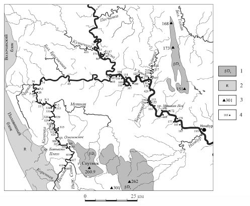 2. Fig. 1. Topographic layout with outcrops. 1 - valsov basalt covers; 2 - Riphean basement rocks (Tsilemsky Stone); 3 - absolute elevations of elevations; 4 - outcrops referred to in the text.