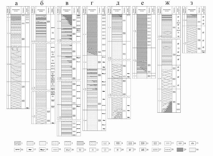 3. Fig. 2. Consolidated lithological columns of suites. (a) Valsov Formation; (b) Tselem Formation; (c, d) - Ustchirkinskaya suite in the lowlands (c) and in elevated areas (d); (d, e) - the lower Ustyareg unit is completed in depressions (e) and in elevated areas (e); (g) - the upper estuary-raga was developed; (h) - Kraypolskaya suite. 1–7 - rocks: 1 - conglomerate, 2 - gravelite, 3 - sandstone, 4 - tuffite, 5 - aleurolite, 6 - clay, clayey rocks, 7 - limestone; 8–13 - layering: 8 - large oblique, 9 - multi-shaped, 10 - oblique multidirectional, 11 - skew-wavy multidirectional, 12 - wavy, 13 - parallel; 14–16 - nodules: 14 - large ellipsoidal, 15 - caraboobraznye, 16 - MKPON; 17–19 - fossil flora: 17 - large fragments of plants, 18 - abundant fine detritus, 19 - insitis root systems; 20–25 - fossil fauna and traces of its vital activity: 20 - armored fish, 21 - conchostrac shells, 22 - brachiopod shells, 23 - crinoids, 24 - chondrites, 25 - strokes and ice floes; 26 - relics of the weathering crust; 27 - Kaliche; 28 - Katuns with organogenic detritus; 29 - red sediments; 30 - LCD.