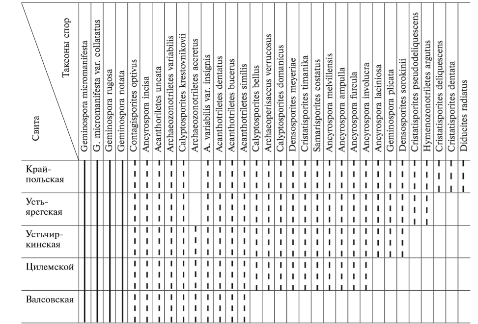 На Среднем Тимане в бассейне р. Цильма в девонских отложениях выделены пять палинокомплексов (ПК) – в валсовской, цилемской, устьчиркинской, устьярегской, крайпольской свитах (табл. 3). Установленные ПК хорошо коррелируются с одновозрастными палинокомплексами смежных территорий – в стратотипических разрезах на Южном Тимане (стратотипы тиманской и устьярегской свит), в Печорской синеклизе (джъерский горизонт) и в более отдаленных разрезах на гряде Чернышева, Главного девонского поля (Тельнова, 2007, 2013).