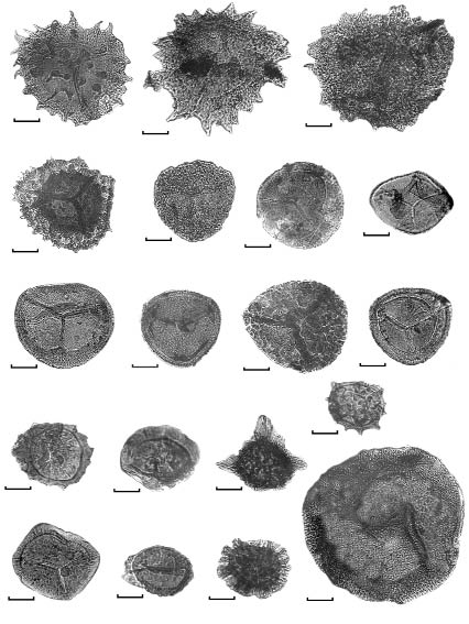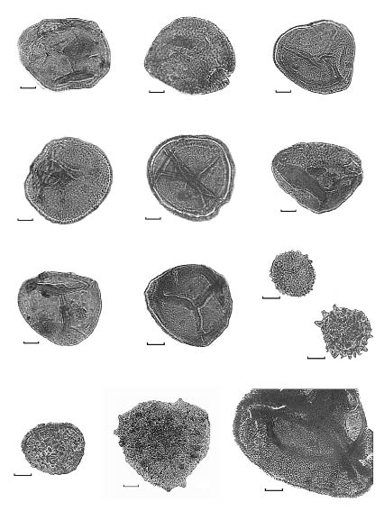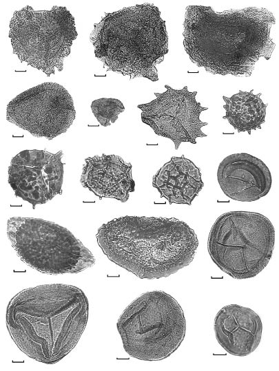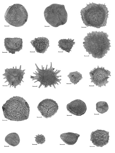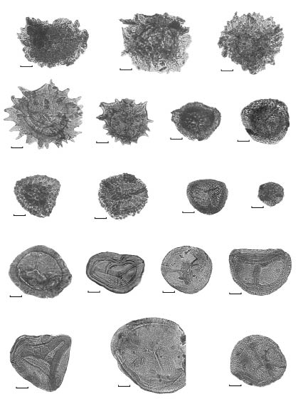 В валсовских ПС субдоминантную группу формировали мелкие споры (20–40 мкм) с мелкошиповатой скульптурой экзины Acanthotriletes bucerus, A. eximius, A. similis и др. В субрецентных и рецентных ПС уменьшение размеров спор и пыльцы, мелкошиповатая скульптура связываются с ухудшением фациально-климатических условий произрастания их продуцентов (Сладков, 1967). По аналогии можно предположить, что увеличение количества и разнообразия спор группы Acanthotriletes может свидетельствовать о некоторой аридизации и, возможно, небольшом похолодании в этом временном интервале.