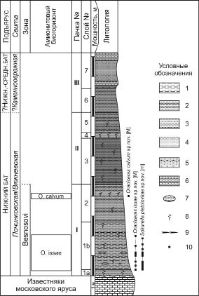 Нижняя часть зоны Besnosovi изучена автором совместно с А.П. Ипполитовым (ГИН РАН) в разрезе Плетневский (рис. 2) в 2016 г. Батские отложения обнажены здесь во вскрыше северо-западной стенки Плетневского каменного карьера НПО “Известняк” (53.860° с.ш., 44.693° в.д.), расположенного в правом борту долины р. Исса напротив с. Каменный Брод и д. Плетневка Иссинского района Пензенской области. Юра залегает непосредственно на известняках среднего карбона и представлена морскими (пачка I) и прибрежно-морскими (пачка II) глинистыми образованиями починковской/вяжневской свиты, переходящими в прибрежно-континентальные (пачка III) глинисто-песчаные осадки нижней части каменноовражной (?или лукояновской) свиты. На ровной ожелезненной поверхности окремненных известняков московского яруса залегают: