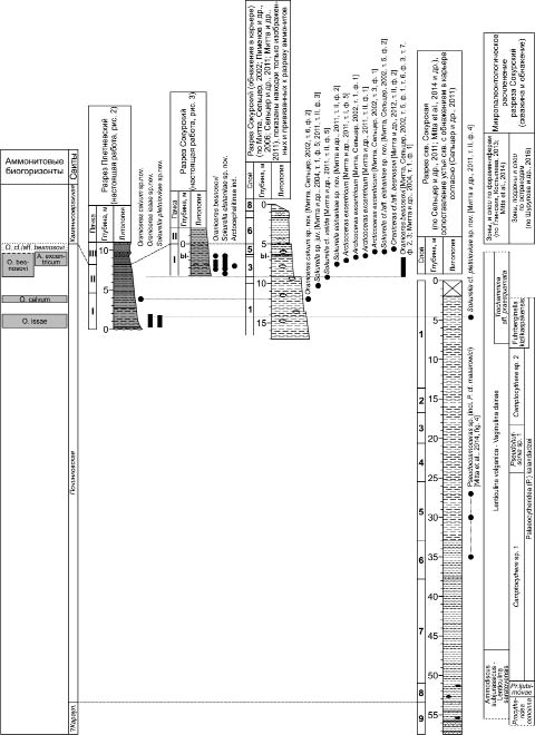 Таким образом, собственный материал позволяет выделить в изученной части разреза единственный аммонитовый биогоризонт O. besnosovi. В то же время многочисленные опубликованные данные дают возможность существенно расширить биостратиграфическую характеристику Сокурского разреза. Определенное затруднение в интерпретации этих данных вызывает отмеченное ранее (Гуляев, 2013) существенное расхождение в опубликованных литолого-стратиграфических описаниях. Так, в работах, изданных до 2011 г., кровля нормально-морских глинистых отложений нижнего бата с остатками аммонитов указывалась приблизительно на 1.5 м (Митта, Сельцер, 2002; Пименов и др., 2006; Сельцер и др., 2011) или 1.1 м (Митта и др., 2004, 2011) выше реперного “белемнитового уровня”, а в основании перекрывающих отложений “среднего бата” описывается слой плотного ржаво-бурого алевролита. Начиная с 2012 г. в публикациях с участием тех же авторов кровля нижнебатских нормально-морских глин с аммонитами и белемнитами помещалась уже приблизительно в 5.4 м выше “белемнитового уровня”, а пласт алевролитов указывался еще на 3.5 м выше (Митта и др., 2012; Mitta et al., 2014; Дзюба и др., 2017). По наблюдениям автора, кровля нормально-морских глинистых отложений фиксируется по отчетливому размыву в 1.55 м выше “белемнитового уровня”, а подошва пласта бурых алевролитов располагается на ~3.1 м выше этого размыва. Объяснить указанные расхождения латеральным изменением первичного строения разреза в локальном обнажении весьма сложно. Возможно, они объясняются древними оползневыми процессами в борту долины р. Елшанка. При этом есть достаточные основания считать, что реперный “белемнитовый уровень” (“bl”) во всех работах понимается одинаково. Если использовать его в качестве опорного горизонта для привязки аммонитов, то интервал расхождения мощностей не оказывает существенного влияния на интерпретацию биостратиграфических данных, поскольку в нем определимых аммонитов не отмечается. Сопоставление опубликованных данных по разрезу Сокурский (обнажение и скважина) с собственными материалами по описанным выше разрезам показано на рис. 4.