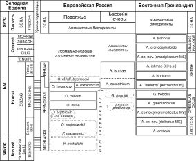 Рис. 5. Корреляция зональных и инфразональных шкал верхов байоса и нижней части бата Западной Европы, Европейской России и Восточной Гренландии (последняя шкала использована в качестве основы вертикального масштаба).