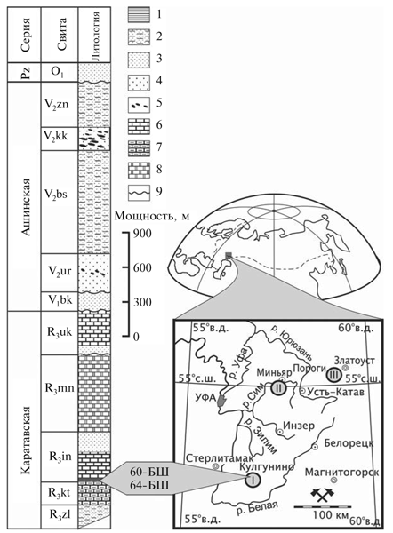 1 – аргиллиты; 2 – алевролиты и аргиллиты; 3 – тонкозернистые песчаники и алевролиты; 4 – крупнозернистые песчаники; 5 – крупнозернистые песчаники, конгломераты; 6 – известняки; 7 – глинистые известняки; 8 – доломиты; 9 – стратиграфические несогласия. Свиты каратавской серии: R3zl – зильмердакская; R3kt – катавская; R3in – инзерская; R3mn – миньярская; R3uk – укская. Свиты ашинской серии: V1bk – бакеевская; V2ur – урюкская; V2bs – басинская; V2kk – куккараукская; V2zn – зиганская. Показано стратиграфическое положение образцов, использованных для выделения тонкозернистых глинистых субфракций. Цифры в кружках обозначают разрезы, в которых были отобраны образцы: I – Кулгунино, II – Миньяр, III – Пороги.