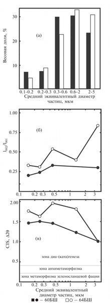 Минералогия глинистых субфракций. Распределение частиц по размерам внутри фракций < 5 мкм обоих образцов аргиллитов, по существу, одинаково (рис. 2а). Преобладают СФ с размером частиц более 0.3 мкм.