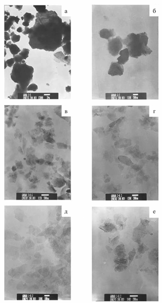 Рис. 3. Микрофотографии минеральных частиц в различных размерных субфракциях обр. 60-БШ, полученные методом просвечивающей электронной микроскопии. (а) – СФ 2–5 мкм, масштабная линейка 2 мкм; (б) – СФ 0.6–2 мкм, масштабная линейка 0.5 мкм; (в) – СФ 0.3–0.6 мкм, масштабная линейка 0.5 мкм; (г) – СФ 0.2–0.3 мкм, масштабная линейка 0.2 мкм; (д, е) – СФ 0.1–0.2 мкм, масштабная линейка 0.1 мкм (д), 0.2 мкм (е).