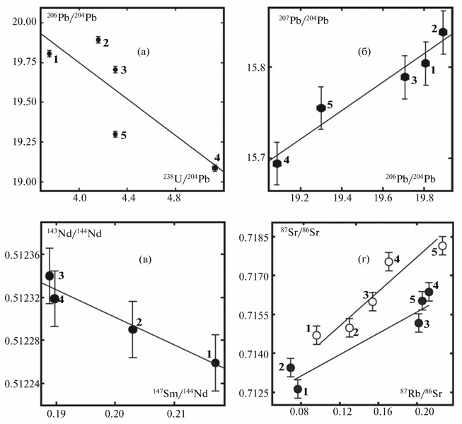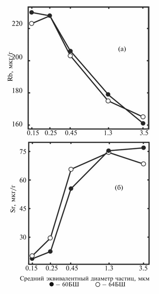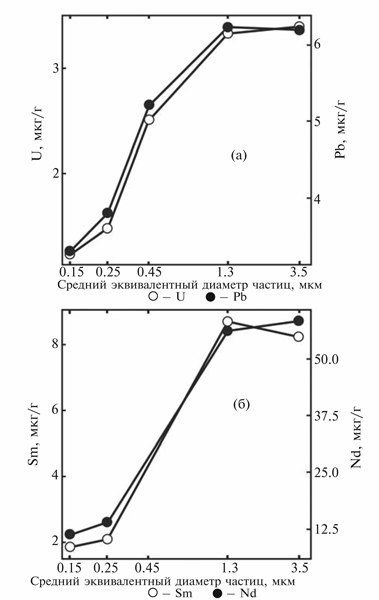 Отношения 238U/204Pb (табл. 3) и 87Rb/86Sr (табл. 5) в кислотных и ацетатных вытяжках ниже, а отношение 147Sm/144Nd (табл. 4) выше, чем в остатках от выщелачивания. Для вытяжек также характерны менее радиогенные Pb и Sr и более радиогенный Nd по сравнению с остатками. Отсюда, в частности, следует, что в результате выщелачивания разноразмерных СФ в раствор, наряду с продуктами адсорбции на глинистых частицах, переходит несиликатная минеральная фаза, обогащенная обычными Pb и Sr и радиогенным Nd.