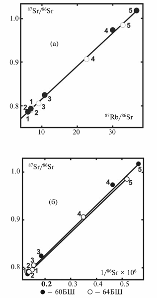 Rb–Sr анализ. Отношение 87Rb/86Sr определяли методом изотопного разбавления с индикаторами 87Rb и 84Sr, и величину 87Sr/86Sr вычисляли по результатам опытов с добавлением индикатора (Горохов и др., 1997). После растворения образца в смеси перегнанных концентрированных HF и H2SO4 химическое разделение Rb и Sr выполняли на ионообменной колонке со смолой Dowex AG50W × 8 (200–400 меш) и использованием 2.5N HCl в качестве элюента. Изотопный состав Sr измеряли в статическом режиме на многоколлекторном масс-спектрометре Finnigan MAT 261 с Re-лентами ионного источника. Нормализация изотопных отношений производилась к значению 86Sr/88Sr = 0.1194. Измерение отношения 87Sr/86Sr в стандартном карбонате стронция NIST SRM 987 в период работы дало значение 0.710250 ± 0.000016 (n = 16, 2sсредн).