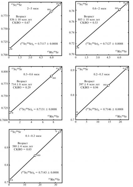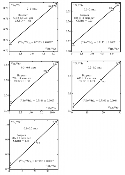 Разрезы верхнего протерозоя, в том числе стратотипические, редко включают вулканиты – носители магматического циркона, возраст которого удобно и достаточно точно определяется U–Pb методом. В результате во многих случаях для получения информации об изотопном возрасте верхнепротерозойских неметаморфизованных отложений необходимо изучение аутигенных осадочных минералов. Среди них особое место занимает иллит. Этот обычный аутигенный минерал возникает в ходе диагенеза глинистого осадка через некоторое время после его отложения и последующего превращения в аргиллит. Верхнепротерозойские аргиллиты зачастую включают смесь нескольких генераций иллита (детритовых и аутигенных), образованных в разное время, в разных геохимических обстановках и различных по составу и структуре (см., например, Morton, 1985a; Bonhomme, 1987; Burley, Flisch, 1989; Lander et al., 1991; Mossman, 1991; Lanson, Besson, 1992; Gorokhov et al., 1994, 2001; Clauer, Chaudhuri, 1995; Горохов, 1996; Зайцева и др., 2009). Однако, поскольку каждой глинистой генерации свойственно индивидуальное распределение частиц по размерам, существует принципиальная возможность их разделения или обогащения с помощью седиментационного анализа (Clauer et al., 1990; Bros et al., 1992; Schaltegger et al., 1994; Zwingmann et al., 1999). В наиболее крупнозернистых и тонкозернистых субфракциях (СФ), в которых размер глинистых частиц варьирует в достаточно узких пределах и составляет соответственно первые микроны и доли микрона, обычно преобладают конечные члены этих смесей, представленные некогенетичными генерациями индивидуальных минералов (Gorokhov et al., 1994, 2001; Горохов и др., 1997, 2002, 2006, 2010; Grathoff et al., 1998, 2001; Зайцева и др., 2009). Минералогическая идентификация глинистого компонента СФ проводится с помощью рентгеноструктурного фазового анализа, а также путем определения политипии иллита и его индекса кристалличности (Kubler, 1966, 1990; Pevear, 1992; Grathoff, Moore, 1996, 2002; Meunier, Velde, 2004). Для датирования иллита часто используется методика выщелачивания и последующий изохронный анализ (Clauer et al., 1990, 1993; Clauer, Chaudhuri, 1995; Ohr et al., 1991, 1994; Bros et al., 1992; Gorokhov et al., 1994, 2001; Schaltegger et al., 1994; Gauthier-Lafaye et al., 1996; Горохов и др., 1997, 2002, 2007). При этом вычисленные значения возраста имеют геологический смысл только для тех фракций, которые содержат практически чистые или по меньшей мере сильно обогащенные конечные члены глинистых смесей. Для промежуточных же фракций значения возраста, как правило, не могут быть интерпретированы в рамках каких-либо геологических событий.