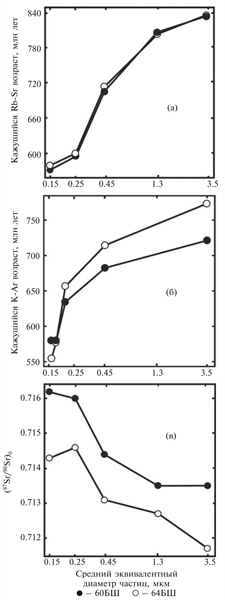 Изотопная геохимия. Sm–Nd данные для валовых проб терригенных пород приведены в табл. 2, а результаты U–Pb, Sm–Nd, Rb–Sr и K–Ar анализа необработанных СФ, кислотных и ацетатных вытяжек и остатков от выщелачивания для изученных образцов аргиллитов представлены в табл. 3–6. Обращает на себя внимание плавное изменение большинства параметров в СФ по мере изменения размера частиц. В частности, уменьшение последних сопровождается ростом содержания К и отношения K/Rb (табл. 6).