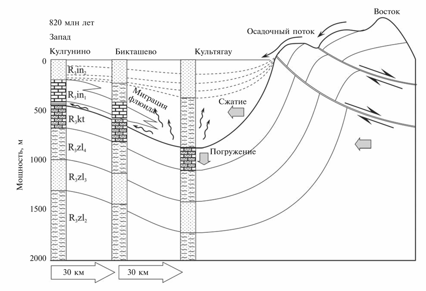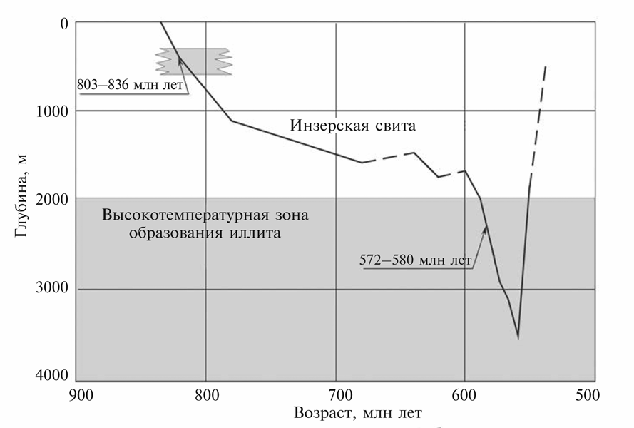 Примечание. Возраст пород инзерской свиты принят равным 836 млн лет (Овчинникова и др., 1998).